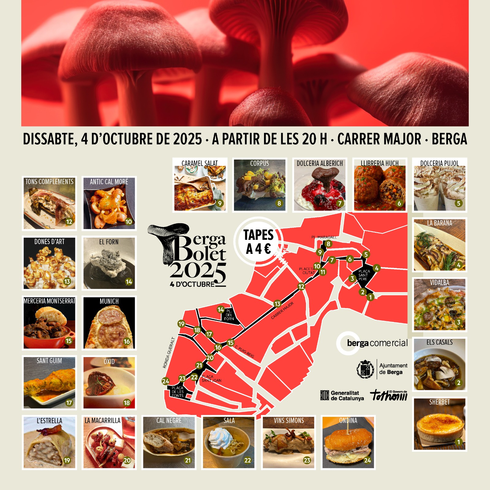 El plat fort però, com és tradició, arribarà al vespre amb el Concurs de Tapes del Bolet, a càrrec dels restauradors de la comarca, que es posaran davant dels establiments del carrer Major a servir les tapes del Bolet, amb ambientació musical de diversos solistes i grups musicals repartits per tot el recorregut. Aquesta edició, compta amb més