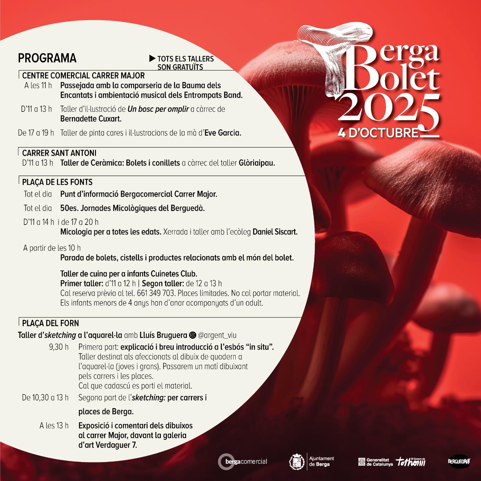 A la plaça de les Fonts hi haurà la 50a trobada micològica, on tothom podrà resoldre dubtes i curiositats dels bolets exposats. També hi haurà tallers i xerrades, durant tot el dia, per a totes les edats, relacionades amb el món del bolet, com pintacares, estampació, ceràmica, cuinetes,…