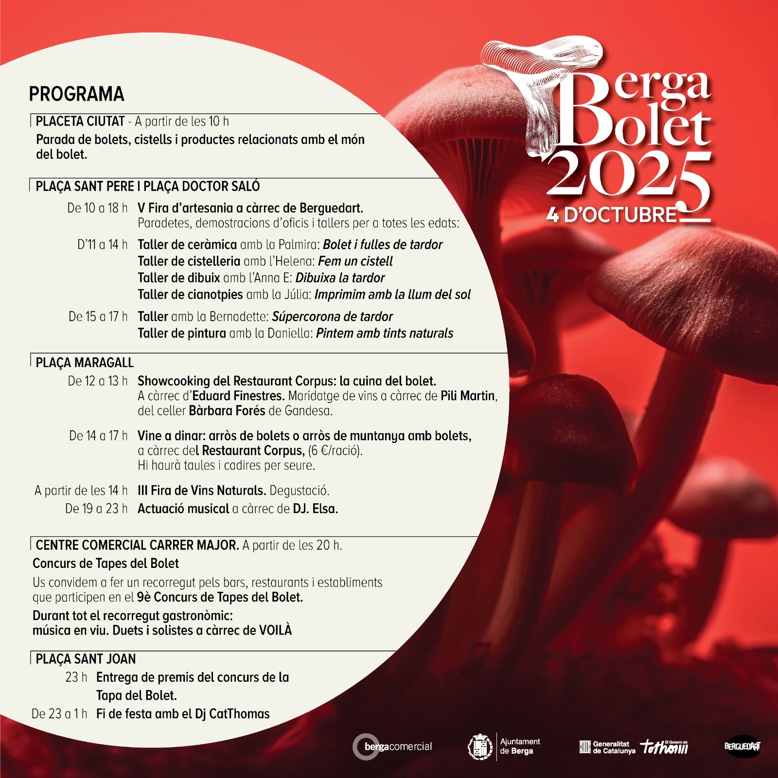 L’Ajuntament de Berga ha complementat els actes amb la V Fira d’Artesania a càrrec de l’agrupació BerguedArt, que es situaran entre la plaça de Sant Pere i plaça Doctor Saló, amb un munt de tallers i demostracions d’oficis durant tot el dia.