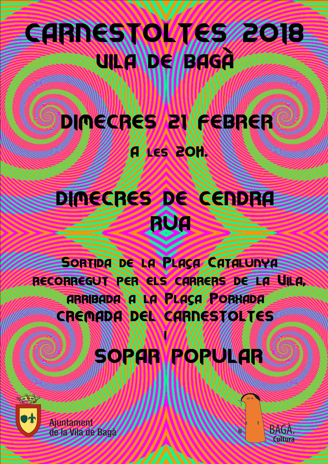 Els actes del Carnestoltes baganès comencen el divendres dia 16 de febrer amb el dia dedicat a la mainada. A la tarda hi haurà rua fins al pavelló on els participants podran berenar i gaudir de l’actuació de Divertimento.