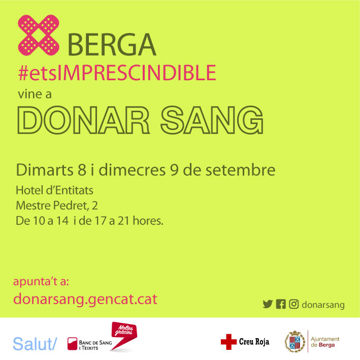 Berga se suma novament al conjunt de municipis que donen suport a les campanyes de donació de sang a Catalunya facilitant espais per acollir jornades d’acapte. Els dies 8 i 9 de setembre, l’Hotel d’Entitats disposarà d’un espai de donació, de 10 a 14 h i de 17 a 21 h. Per realitzar el procés de donació amb seguretat, les persones que vulguin participar en aquesta acapte hauran de reservar cita prèvia a través del web donarsang.gencat.cat. El passat mes de juny es va portar a terme una campanya de tres dies que va registrar un total de 265 donacions de veïns i veïnes.