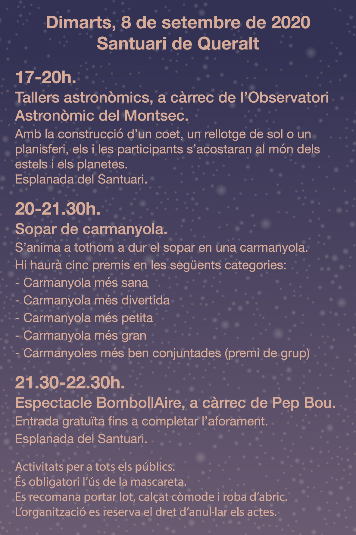 L’artista Pep Bou clourà la Gala d’Estels amb l’espectacle BombollAire. Es tracta d’una proposta que mostra la bellesa infinita de les bombolles de sabó des del punt de vista de la física i la química, així com la seva poètica. A l’aire lliure, les bombolles descobreixen nous moviments, noves formes… En aquest espectacle, la companyia de Pep Bou investiga l’art de fer bombolles en un ambient canviant, l’aire lliure, on les condicions incontrolables influeixen en la creació artística i la fan més efímera i sorprenent. Pep Bou compta amb una trajectòria professional de més de 30 anys d’experiència i amb aquest espectacle es reinventa i s’adapta als nous formats exteriors que demana la situació actual, per a què la cultura no deixi de volar, il·lusionar i fer-nos somiar. L’actuació es farà a 2/4 de 10 del vespre, a l’esplanada situada davant de l’església del Santuari de Queralt, i l’aforament serà limitat. Aquest espectacle requereix unes condicions meteorològiques determinades i en cas que no siguin favorables, l’actuació se suspendrà.