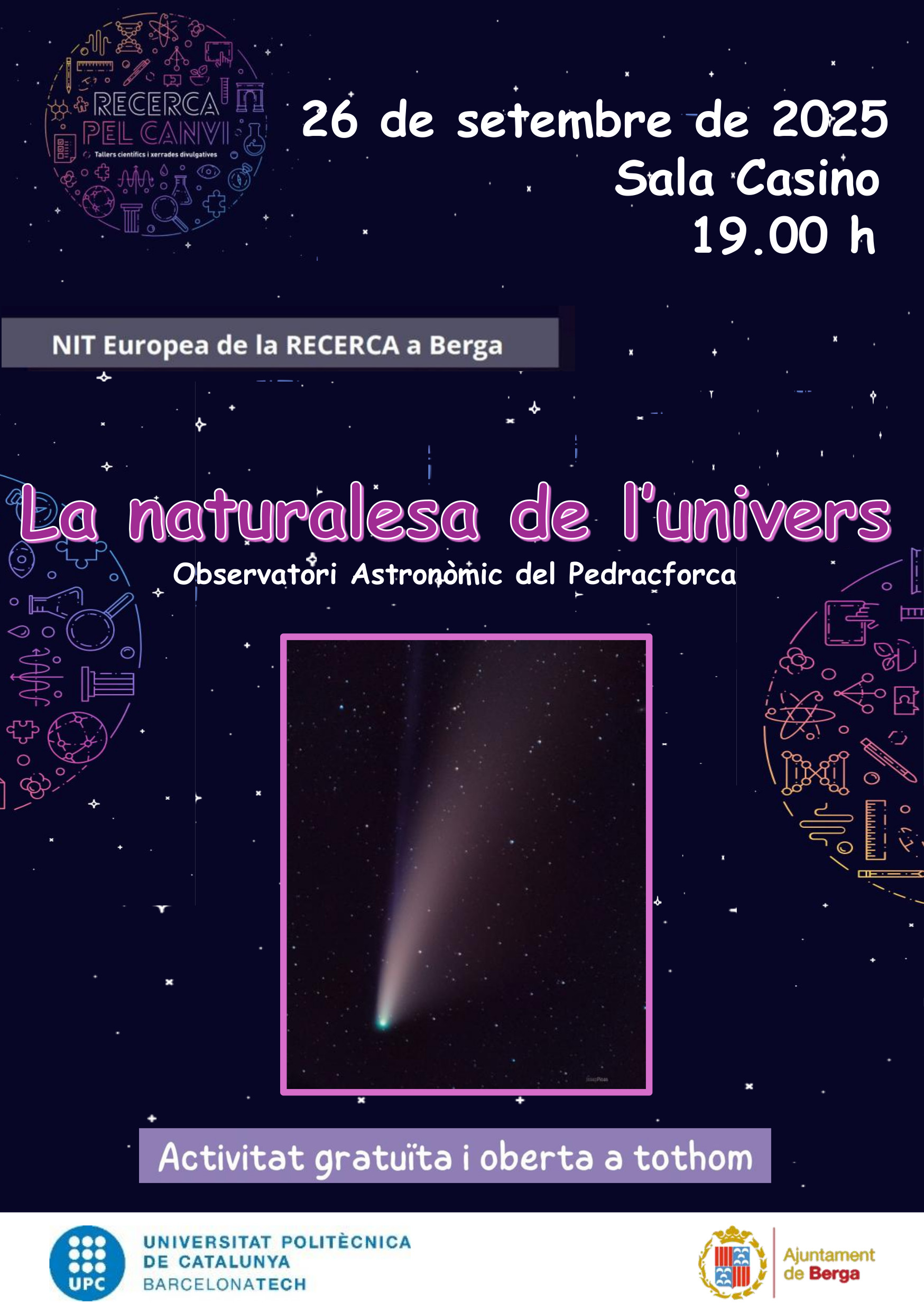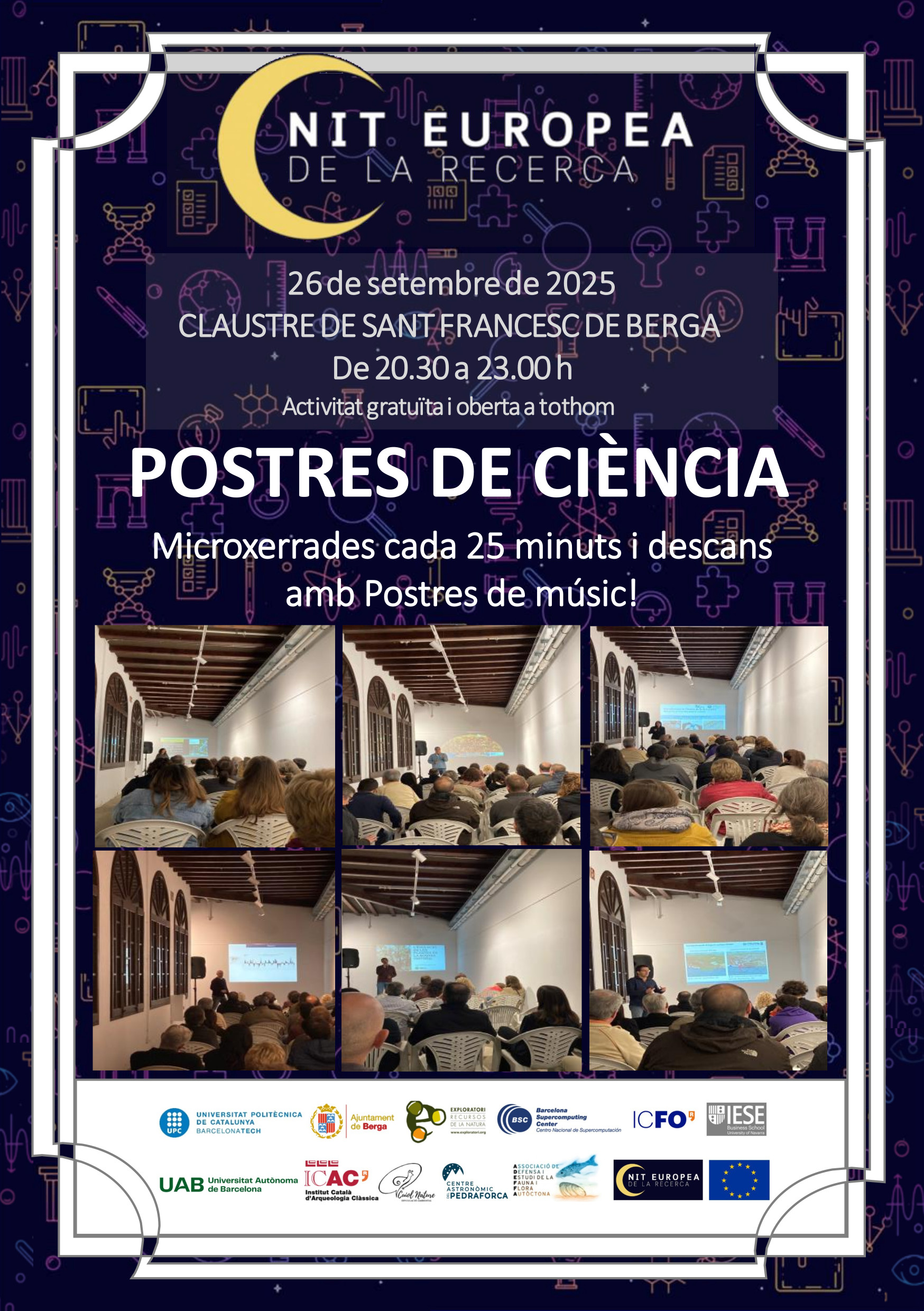 Les conferències es faran al claustre del Convent de Sant Francesc, de 20:30 a 23 h. A més, hi haurà un espai de refrigeri i l’accés serà lliure per tal que tothom pugui assistir a les xerrades que prefereixi. Per a més informació, es pot consultar el portal web de la Nit Europea de la Recerca a Berga en aquest enllaç: https://exploratori.upc.edu/ca/nit-de-la-recerca/nit-de-la-recerca-2025