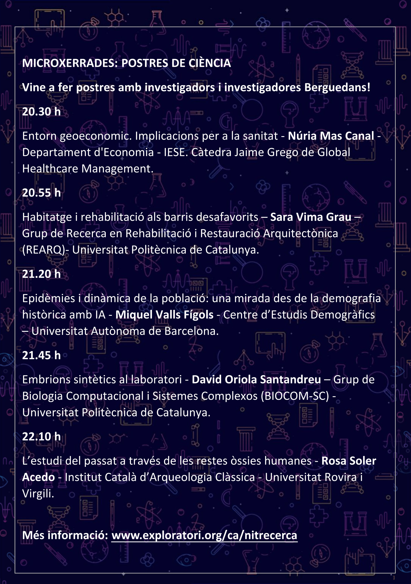 La Nit Europea de la Recerca finalitzarà amb un cicle de xerrades breus, d’entre 15 i 20 minuts, a càrrec d’investigadors berguedans de diferents àmbits científics: Núria Mas Canal, Sara Vima Grau, Miquel Valls Fígols, David Oriola Santandreu i Rosa Soler Acedo. La programació estarà formada per cinc microxerrades sobre l’entorn geoeconòmic global i les implicacions en el benestar i el sistema sanitari; l’habitatge i rehabilitació d’edificis als barris desafavorits; l’ús de la intel·ligència artificial per a l’anàlisi de la demografia; la neurociència i les seves implicacions en la medicina personalitzada, la infertilitat i la modelització de malalties; l’estudi del passat a través de les restes òssies humanes.