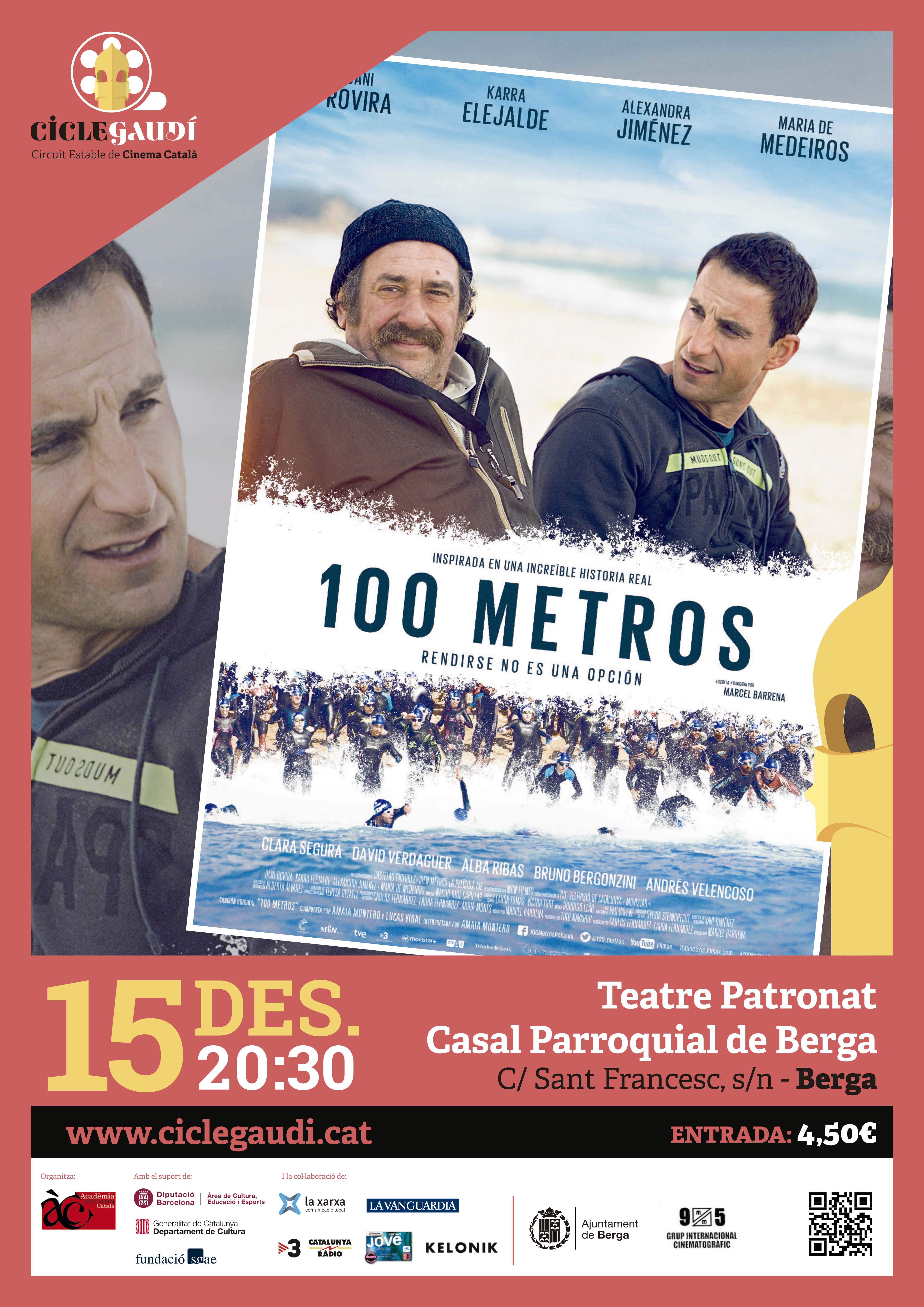 Aquest dijous 15 de desembre acaba la programació de l’edició d’enguany del Cicle Gaudí a Berga amb la projecció de la pel·lícula ‘100 metros’ de Marcel Barrena. El film protagonitzat perDani Rovira, Karra Elejalde, Alexandra Jiménez, María de Medeiros, David Verdaguer i Clara Segura, es projectarà al Teatre Patronat a 2/4 de 9 del vespre.