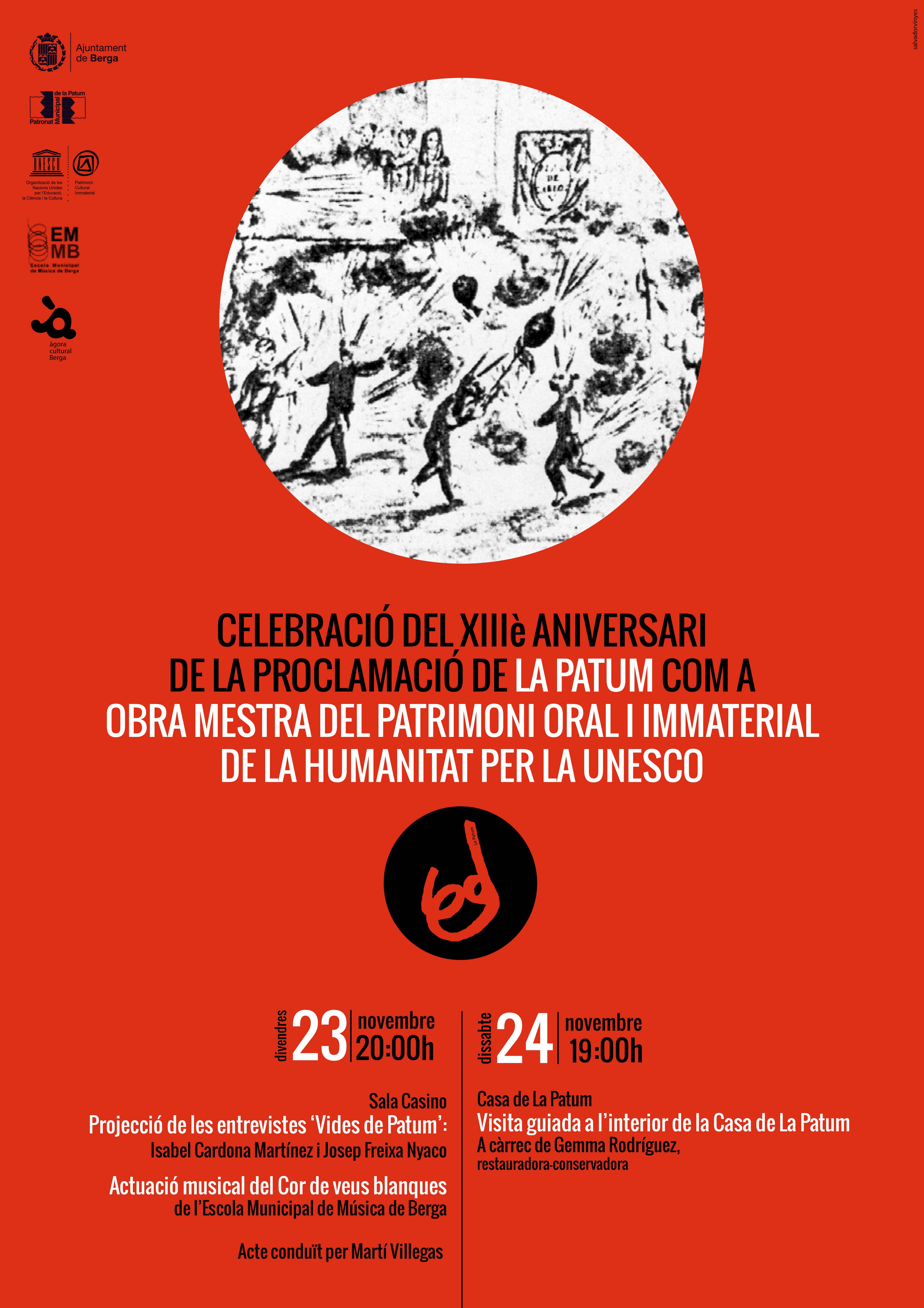 El 25 de novembre es compliran 13 anys des que La Patum va ser proclamada com a Obra Mestra del Patrimoni Oral i Immaterial de la Humanitat per part de la UNESCO. Per celebrar l’efemèride, l’Ajuntament de Berga i el Patronat de la Patum han organitzat un acte d’homenatge a persones que han format part de la festa berguedana i que enguany es complementarà amb una visita guiada a la Casa de La Patum en el marc de la iniciativa ‘àgora cultural Berga’. Les activitats es portaran a terme durant els dies 23 i 24 de novembre a la Sala Casino i a la Casa de La Patum, respectivament.