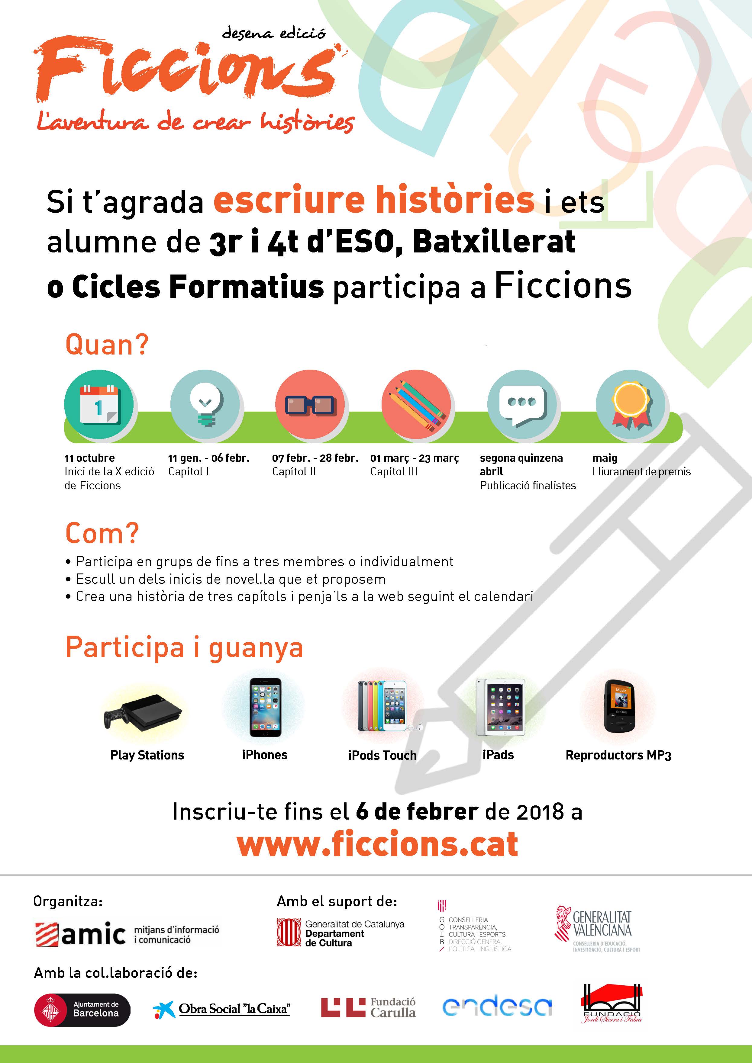 Les inscripcions per participar al certamen de creació literària es van activar el passat 11 d’octubre i segueixen obertes per a qualsevol alumne de 14 a 18 anys fins el dia 6 de febrer a través de la pàgina web: www.ficcions.cat.