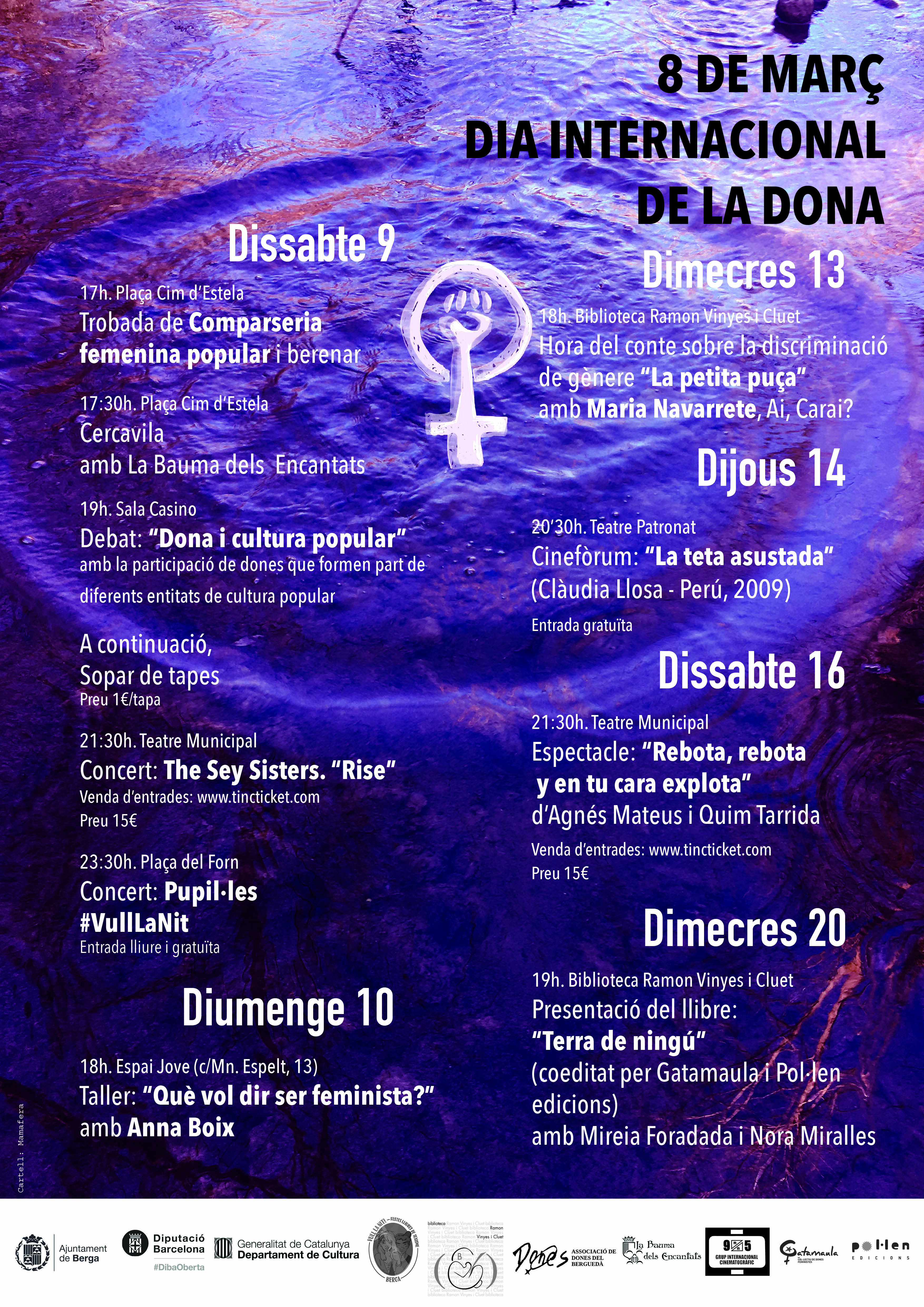 En el marc de la commemoració del Dia Internacional de la Dona Treballadora, que se celebra anualment el 8 de març per reivindicar els drets de les dones en tots els àmbits, les àrees de Drets Socials, Cultura i Joventut de l’Ajuntament de Berga han impulsat una àmplia programació d’activitats culturals que es portaran a terme del 9 al 20 de març de 2019. Enguany, els actes han augmentat significativament gràcies a la implicació de diverses entitats berguedanes que han contribuït a confeccionar un programa farcit de propostes per a tots els públics. La regidora de Cultura i Joventut, Mònica Garcia, ha explicat que “les propostes del 8 de març han estat elaborades des d’una perspectiva feminista”. Garcia ha destacat que “l’objectiu del feminisme es basa en una lluita transversal i col·lectiva per trencar amb el sistema patriarcal, ja que aquest sistema oprimeix greument a les dones però també situa els homes en una rol que no els deixa ser lliures”.