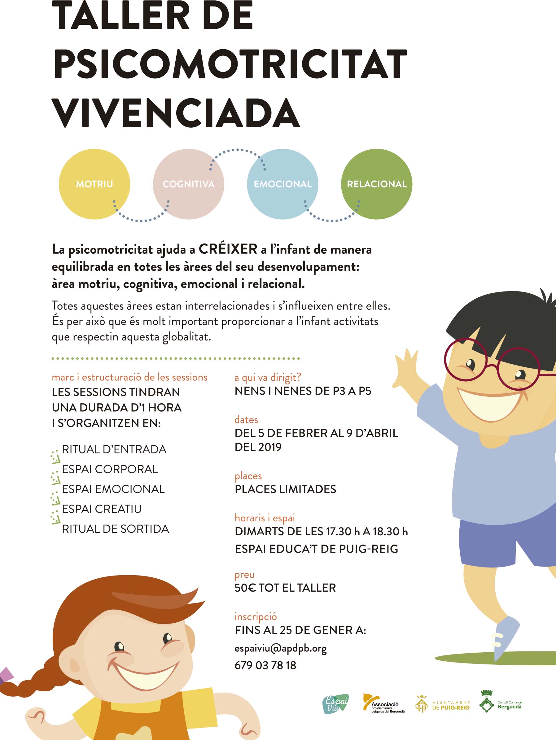 Amb la suma d’esforços de l’Ajuntament de Puig-reig, el Consell Comarcal del Berguedà i l’Associació Pro-Disminuits Psíqics del Berguedà s’ofereixen un taller de 10 sessions a infants de P-3 a P-5 i es farà els dimarts del 5 de febrer al 9 d’abril, a l’espai Educa’t. El taller té un cost de 50 € per infant i es comptarà amb el suport econòmic del Consell Comarcal i la Diputació de Barcelona per tirar endavant l’activitat.