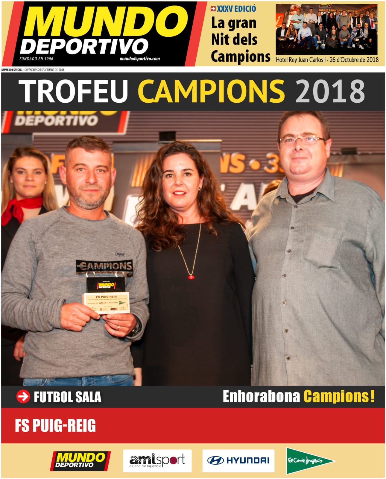 El Futbol Sala Puig-reig va recollir el passat 26 d’octubre el premi per l’ascens de categoria de la temporada 2017-18 durant la 35ª edició del Trofeu de Campions que organitza el diari Mundo Deportivo. La gala es va celebrar a l’hotel Rey Juan Carlos I de Barcelona i va ser presentada per Xavi Andreu, experiodista de TV3 actualment a Mundo Deportivo. Van rebre premis extraordinaris a la seva carrera esportiva Jessica Valls (natació) i Aitor Egurrola (hoquei patins). Premi també per a la seva carrera com a periodista per a Paco Aguilar, de Mundo Deportivo.