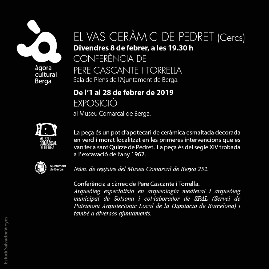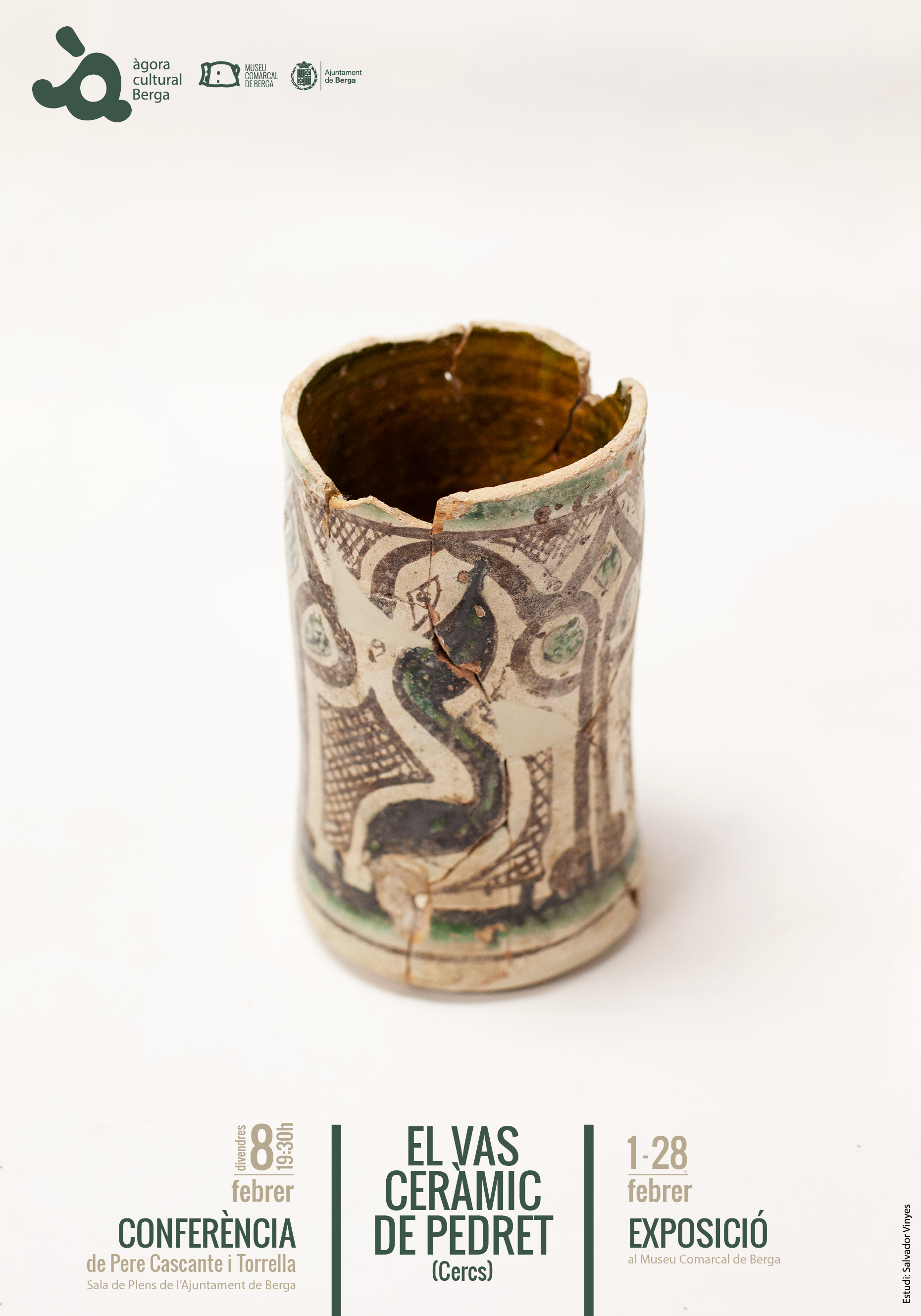 L’Àgora Cultural de Berga continua com cada mes, apropant-nos la cultura i en aquest cas, elements destacats i a voltes poc coneguts que trobarem al Museu Comarcal de Berga situat al carrer dels Àngels. Com sempre, amb la peça del mes, se celebra una xerrada al voltant de l’objecte protagonista. La conferència es farà aquest divendres 8 de febrer a les 19:30h amb el nom de ‘el vas ceràmic de Pedret’ i anirà a càrrec de Pere Cascante i Torrella, arqueòleg especialista en arqueologia medieval, arqueòleg municipal de Solsona, i col·laborador del Servei de Patrimoni Arquitectònic Local de la Diputació de Barcelona. L’Acte, que se celebra a la sala de plens de l’Ajuntament de Berga és obert a tothom.