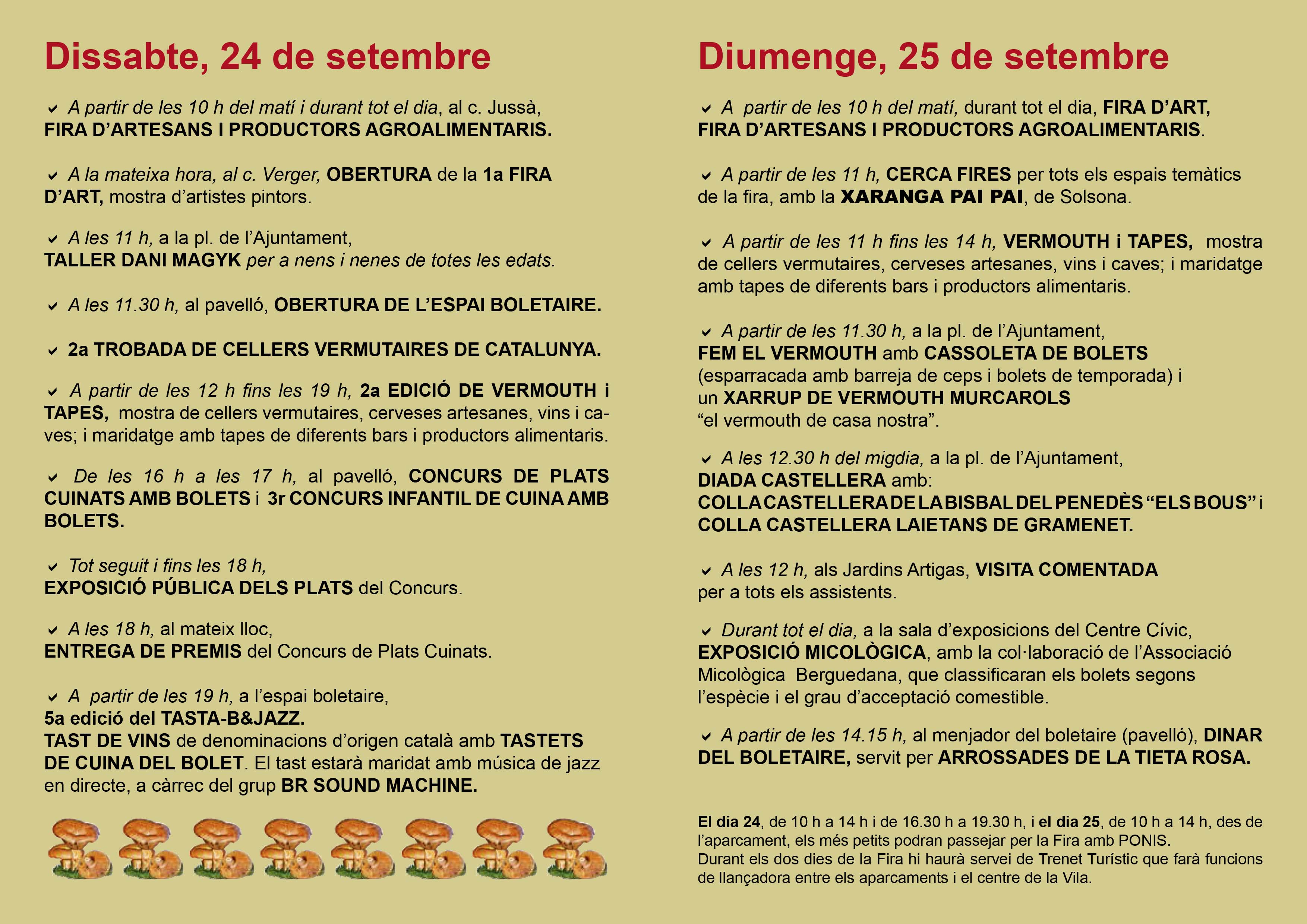 A partir de les 11.30 h, a la pl. de l’Ajuntament, FEM EL VERMOUTH amb CASSOLETA DE BOLETS (esparracada amb barreja de ceps i bolets de temporada) i un XARRUP DE VERMOUTH MURCAROLS “el vermouth de casa nostra”.