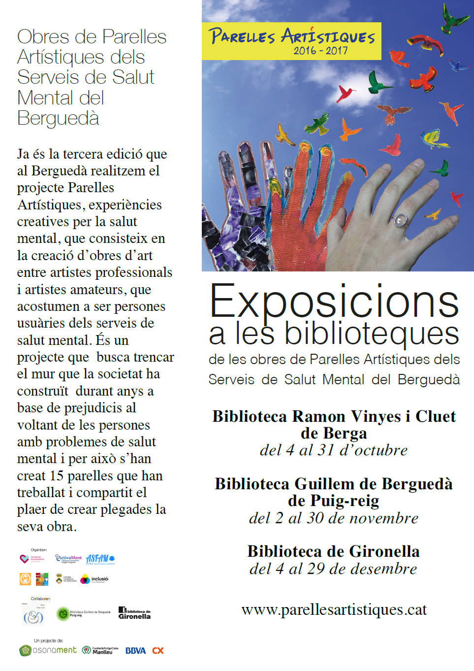 El projecte Parelles Artístiques dels Serveis de Salut Mental del Berguedà ha arribat ja a la tercera edició. Es tracta d’experiències creatives per la salut mental, consistents en la creació d’obres d’art entre artistes professionals i artistes amateurs, que acostumen a ser persones usuàries dels serveis de salut mental. El projecte té l’objectiu de trencar el mur que la societat ha construït durant anys a base de prejudicis al voltant de les persones amb problemes de salut mental. En aquesta edició, s’han creat 15 parelles que han treballat i compartit el plaer de crear plegades la seva obra.