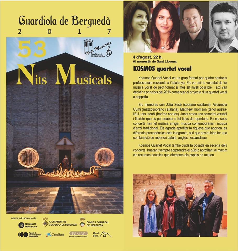 La propera es portarà a terme aquest divendres 4 d’agost amb el quartet vocal Kosmos, al monestir de Sant Llorenç i a les 10 de la nit.