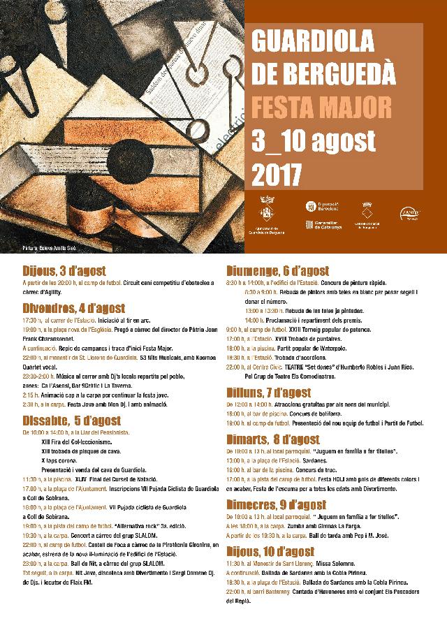 * La planificació anterior pot veure’s modificada en horaris, actes i espais. Us recomanem consultar cartells o pàgina web de l’ajuntament www.guardioladebergueda.net o bé adreçar-se a l’Ajuntament o trucar al 938227059.