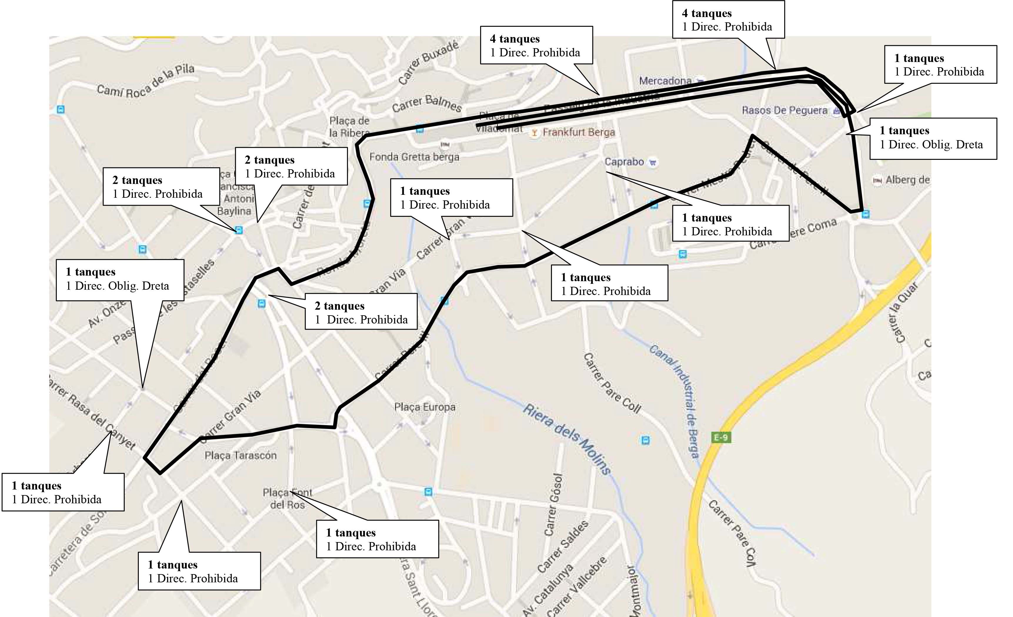 Així, restaran tallats a la circulació de vehicles els carrers passeig Vila de Casserres amb Marià Obiols; el passeig Vila de Casserres amb passeig de la Indústria (davant dels Bombers); passeig de la Indústria amb Residència Germanetes; al passeig de la Indústria (centre davant l’Hotel); ronda de Queralt amb plaça Catalunya; ronda Queralt amb passeig de les Estaselles; al passeig de la Pau (ascendent des de davant de la parada dels taxis); a Frai Frederic amb doctor Fleming; a la Rasa del Canyet amb doctor Fleming; al Comte Oliba amb carrer Sardana; a la carretera Sant Fruitós des de la rotonda de la benzinera fins el carrer del Roser; a la plaça de la Font del Ros amb el carrer Aurora Bertrana; a la Rasa dels Molins; al carrer Lluís Millet des del carrer general Manso Solà fins al carrer Falsilles; al carrer Salvador Espriu; al carrer Mestre Pedret; a l’avinguda del Canal Industrial amb el carrer Gran Via (descendent); al carrer Pere II des del carrer Mestre Pedret fins a la plaça de Gernika, i a la rotonda de la plaça de Gernika.