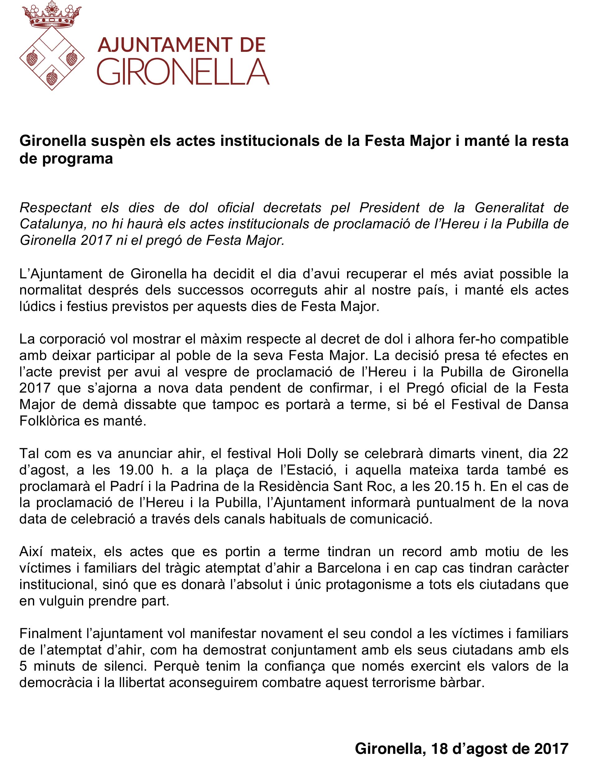 Gironella manté tots els actes que no són institucionals i ha emès aquest comunicat: