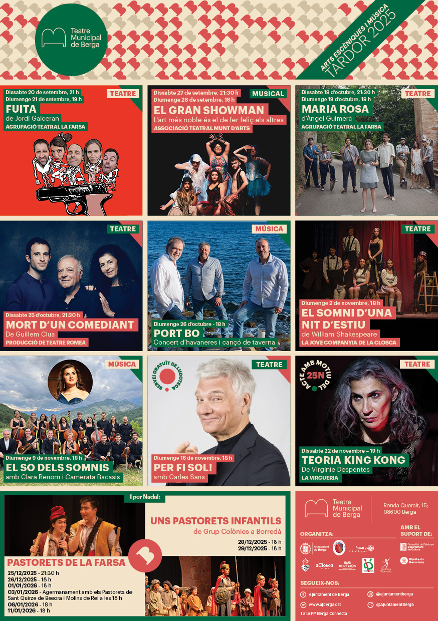 La programació cultural de tardor i hivern està promoguda per l’àrea de Cultura de l’Ajuntament de Berga amb la col·laboració de la Generalitat de Catalunya i la Diputació de Barcelona, a través de Programa.cat. L’oferta d’espectacles es completa amb propostes impulsades per l’àrea de Feminisme del consistori i el teixit associatiu i cultural berguedà.