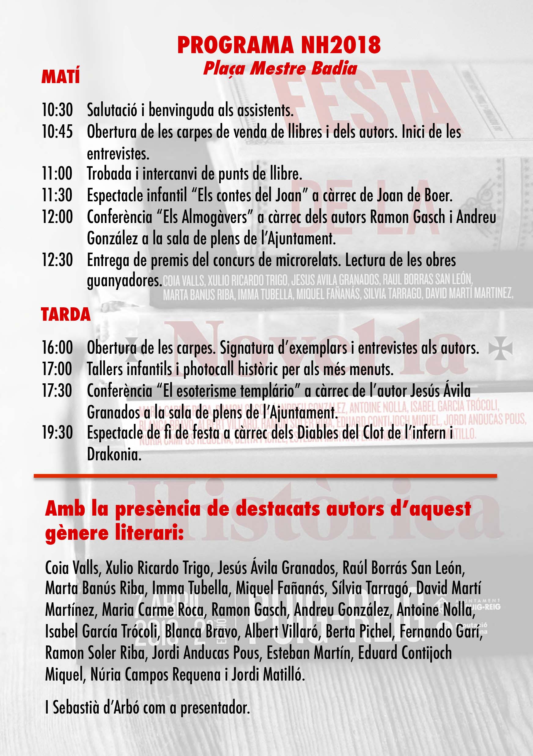 D’altra banda aquest dissabte, 7 d’abril, Puig-reig celebra una nova edició de la Festa de la Novel·la Històrica. La Festa, que durarà tot el dia, es celebra a les carpes situades a la Plaça Mestre Badia de Puig-reig.
