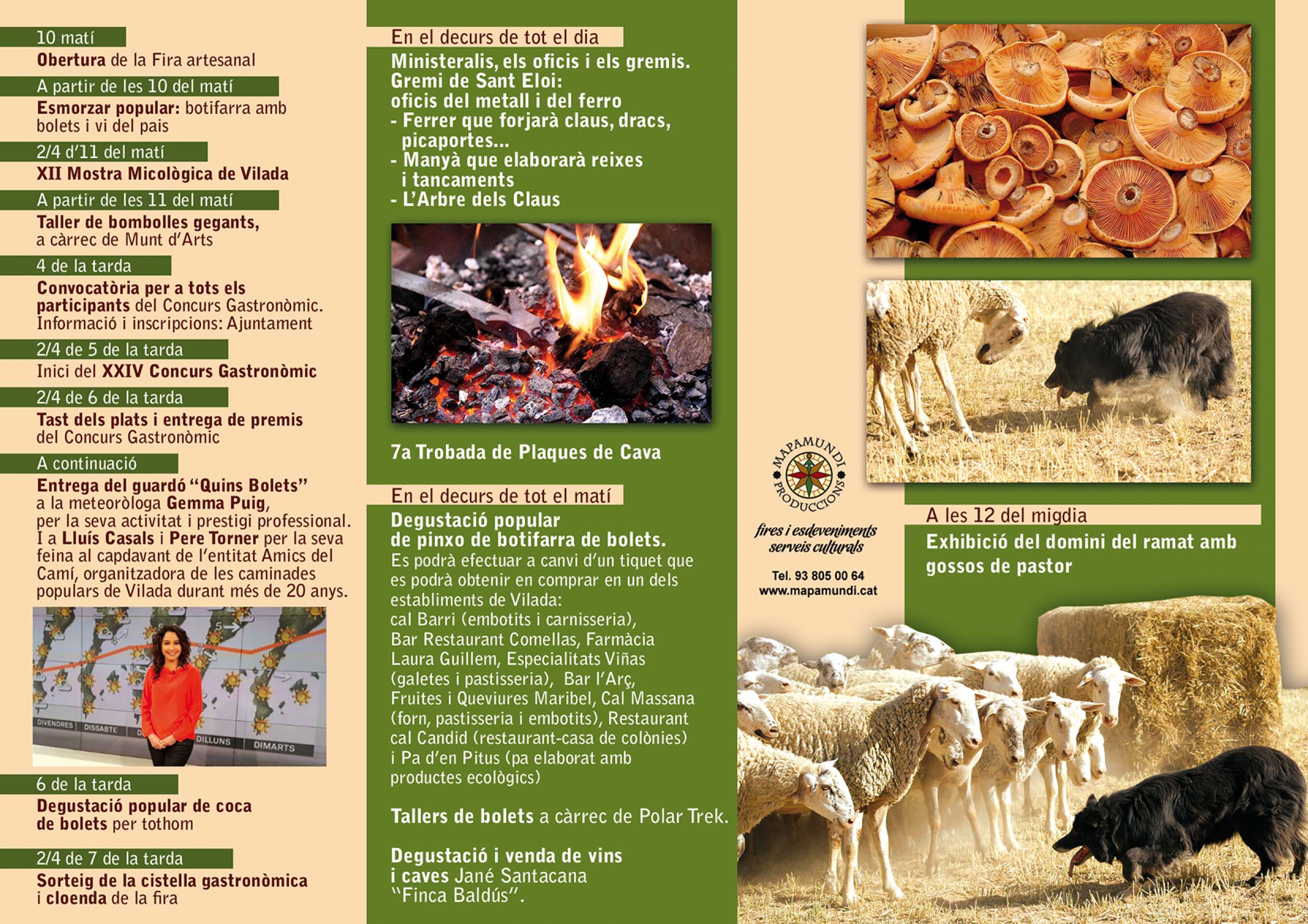 Aquest matí hi ha Fira artesanal, esmorzar popular, Mostra de plaques de cava i Tast popular de botifarra amb bolets. També se celebra la 12a Mostra micològica i un taller amb bombolles gegants. També hi haurà degustació i venda de vins Jané Santacana (finca Baldús) i a les 12, exibició del domini del ramat amb gossos de pastor. A la tarda hi haurà el 24è concurs gastronòmic, el tast del jurat i entrega de premis, i el lliurament del premi “Quins Bolets” a la meteoròloga Gemma Puig i a Lluís Casals i Pere Torner, per la seva tasca al capavant de l’entitat “Amics del Camí” de Vilada. La Festa acabarà amb la degustació popular de coca de bolets i el sorteig de la Cistella Gastronòmica.