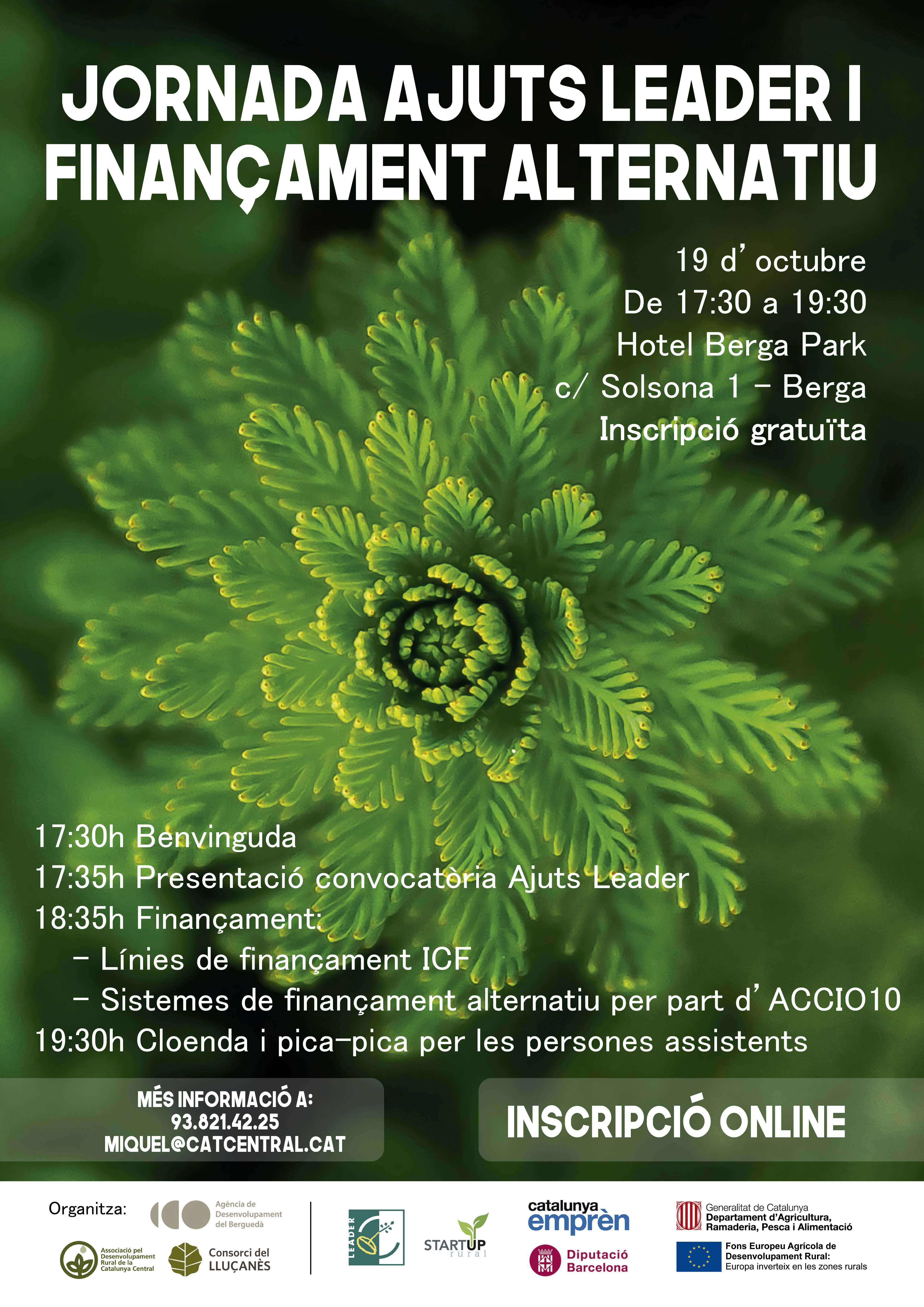 El proper dijous 19 d’octubre se celebrarà a Berga una sessió informativa sobre la nova convocatòria d’ajuts LEADER i sistemes de finançament alternatiu. aquesta es farà a l’Hotel Berga Park de 17.30h a 19.30h