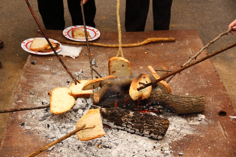 En total, s’ofereixen totes les parts del porc, degudament fetes a la brasa o a la paella, acompanyades amb pa, que la gent pot torrar a la plaça en tres focs a terra. També tenen porrons de vi a la seva disposició i altres begudes. L’any passat es varen consumir prop de 160 quilos de carn de porc i botifarres, 40 quilos de pa, i un bon nombre de litres de vi i altres begudes.