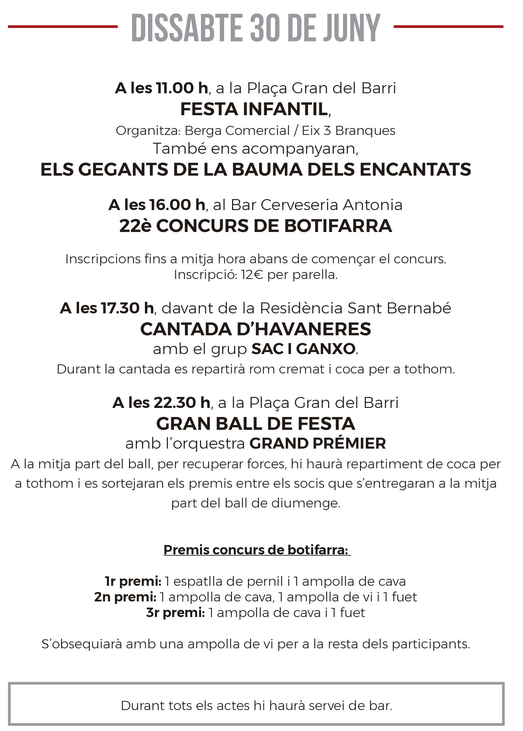 17:30 h, davant de la Residència Sant Bernabé. Cantada d’havaneres amb el grup Sac i Ganxo amb rom cremat i coca per a tothom.