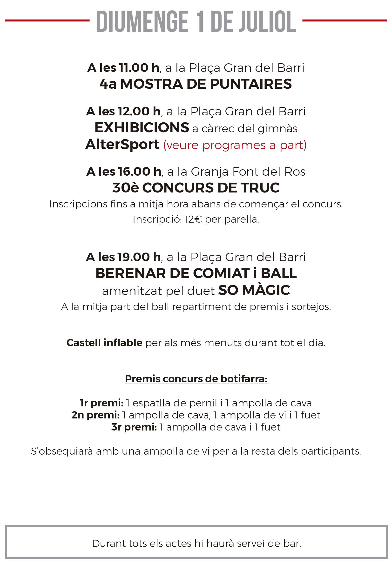 19:00 h, a la Plaça Gran del Barri. Berenar de comiat i ball amenitzat pel duet So Màgic. A la mitja part del ball repartiment de premis i sortejos. Castell inflable per als més menuts durant tot el dia.