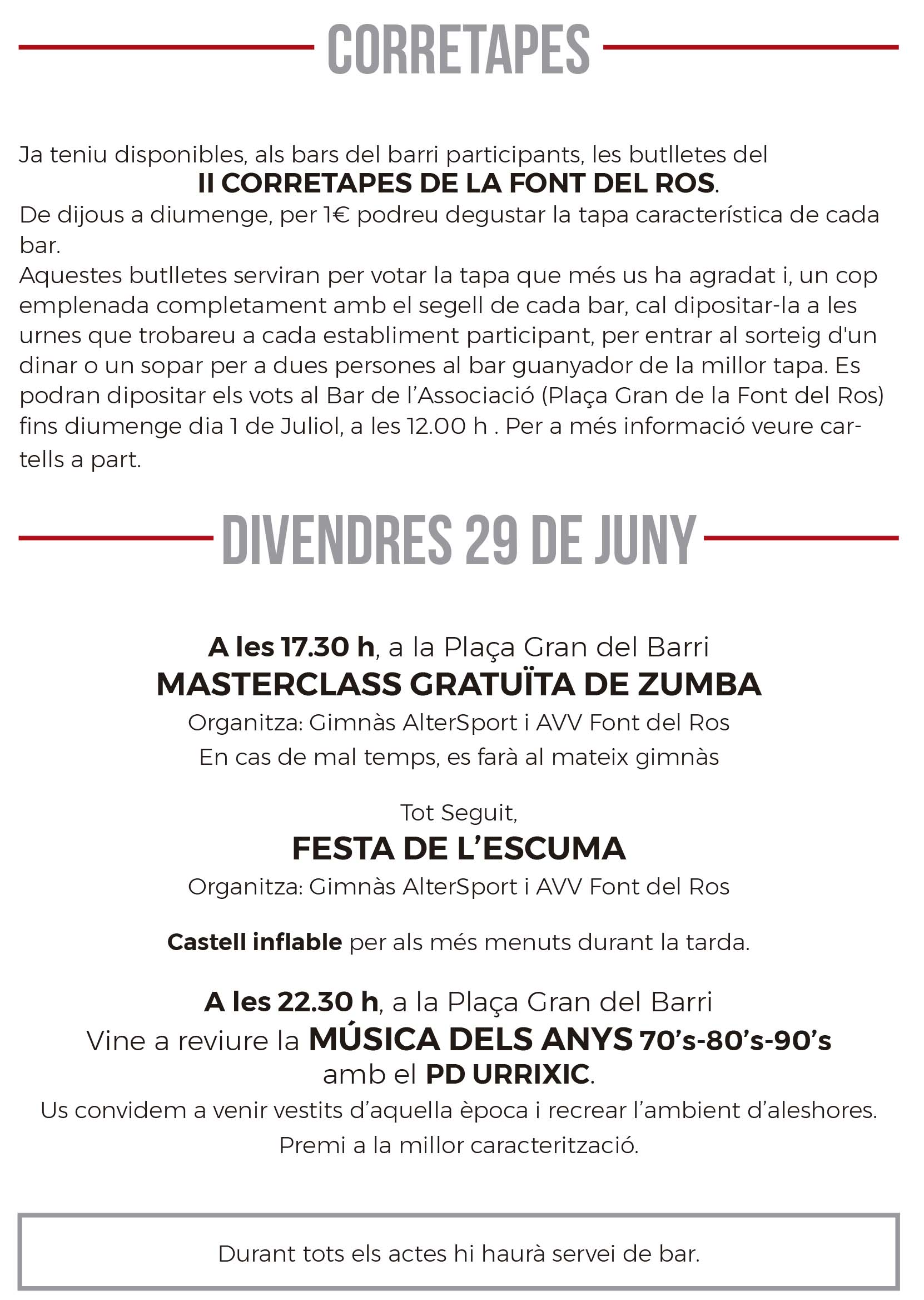 Des del divendres 1 de Juny estan disponibles, als bars del barri participants, les butlletes del II CORRETAPES DE LA FONT DEL ROS. Per 1€ podreu degustar la tapa característica de cada bar. Aquestes butlletes amb el segell de cada bar, cal dipositar-la a les urnes que trobareu a cada establiment participant, per entrar al sorteig d’un dinar o sopar per a dues persones al bar guanyador de la millor tapa. Es podran dipositar els vots al Bar de l’Associació fins diumenge dia 1 de Juliol, a les 12:00 h.