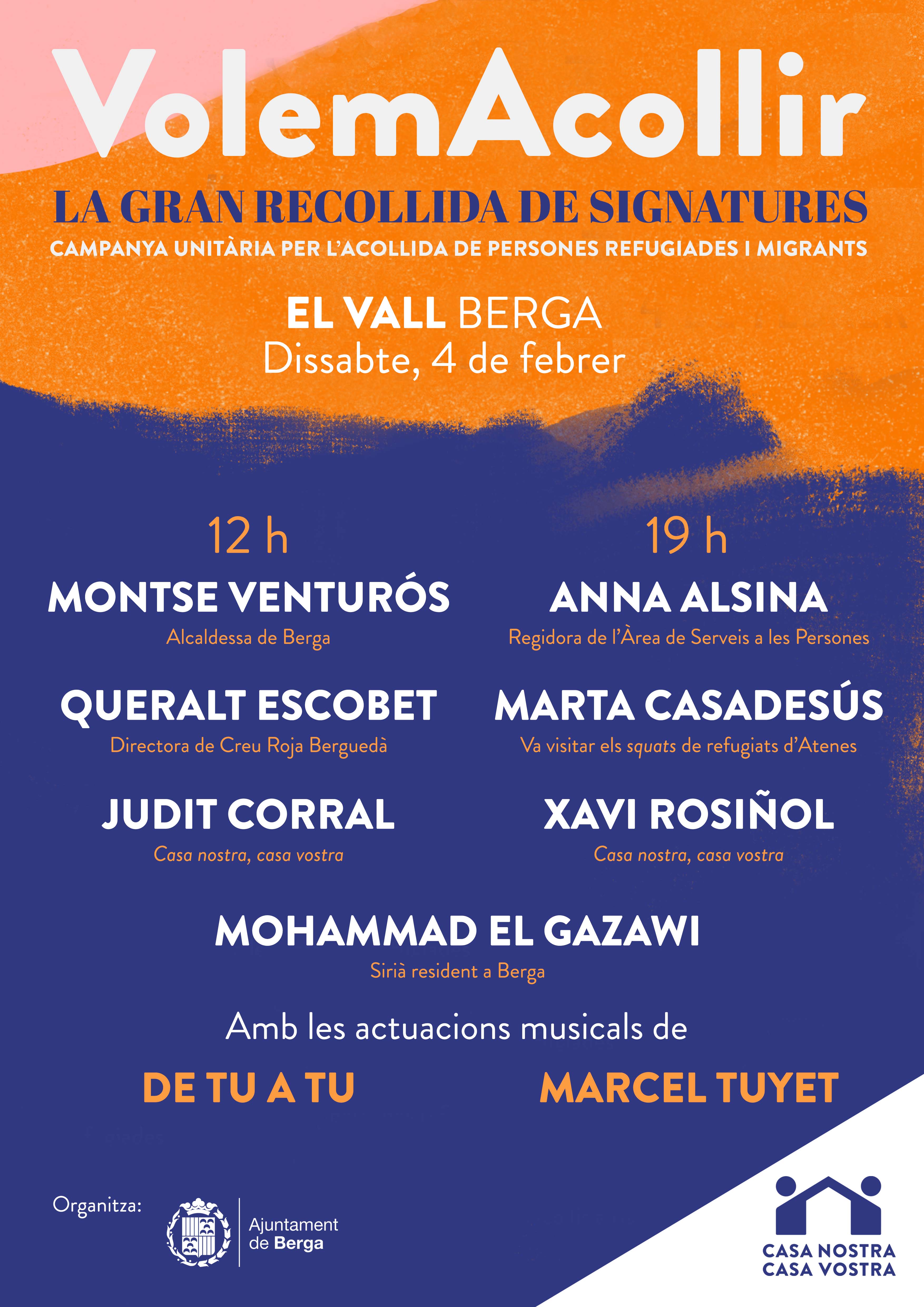 Berga es mobilitza aquest dissabte, 4 de febrer, a favor de l’acollida de persones refugiades i migrants. Durant tot el dia, es recolliran signatures d’adhesió al manifest de Casa nostra, casa vostra, es presentarà la campanya, s’explicaran experiències de voluntariat en camps de refugiats i es donaran detalls del programa d’acollida de persones refugiades que hi ha en marxa la ciutat.