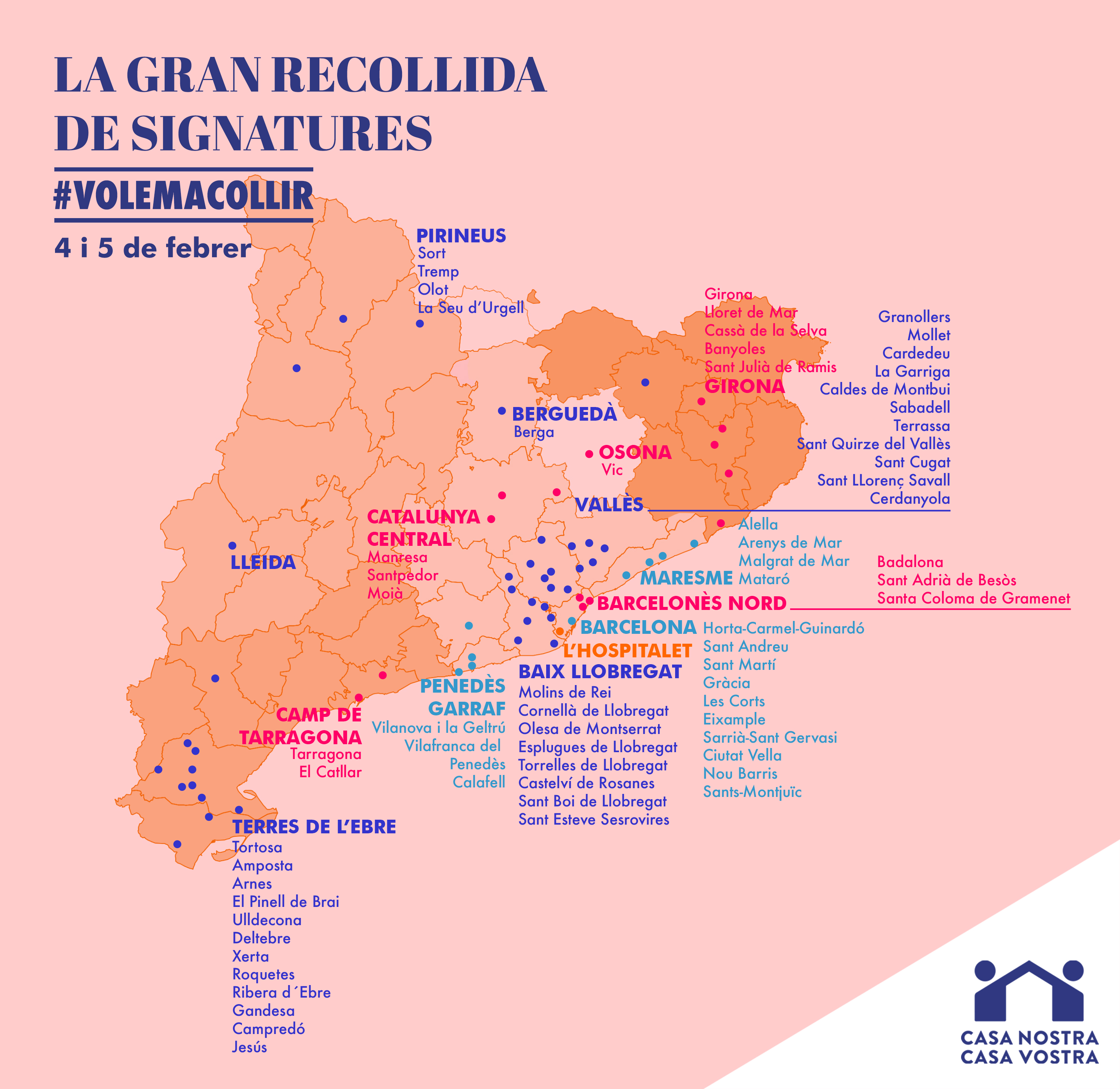 La jornada forma part de la Gran Recollida de Signatures de Casa nostra, casa vostra, que aquest cap de setmana mobilitzarà un centenar de municipis de tot Catalunya. L’activitat es planteja com una marató en què, a través de les xarxes socials, s’anirà actualitzant el marcador de signatures recollides. L’objectiu és obtenir al carrer molts més suports al manifest de la campanya, que fins ara ja han signat unes 50.000 persones.