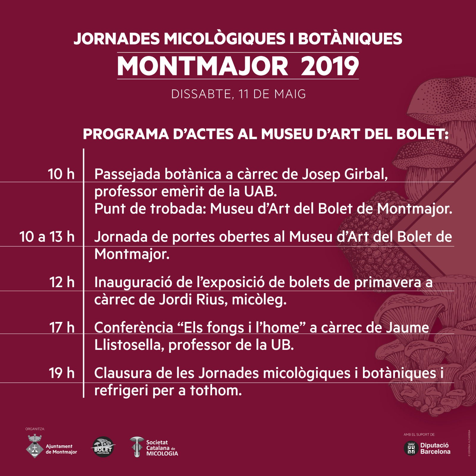 Aquest dissabte 11 de maig se celebra a Montmajor les Jornades micològiques i botàniques 2019, organitzades per l’Ajuntament de Montmajor, el Museu d’Art del Bolet i la Societat Catalana de Micologia amb el suport de la Diputació de Barcelona.
