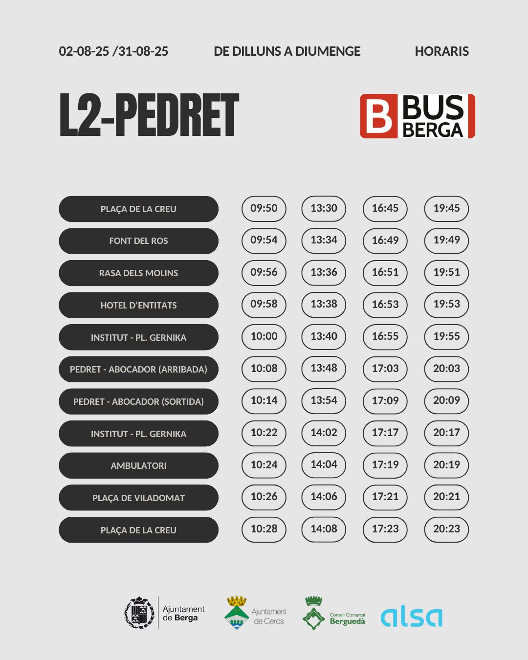 L’any passat es va fer una prova pilot del servei de bus urbà per facilitar el desplaçament fins a Pedret de dilluns a divendres. Vistos els resultats de la prova pilot, l’Ajuntament de Berga, l’Ajuntament de Cercs i el Consell Comarcal del Berguedà han acordat ampliar el servei del bus urbà de Berga per oferir-lo de dilluns a diumenge i també els dies festius.