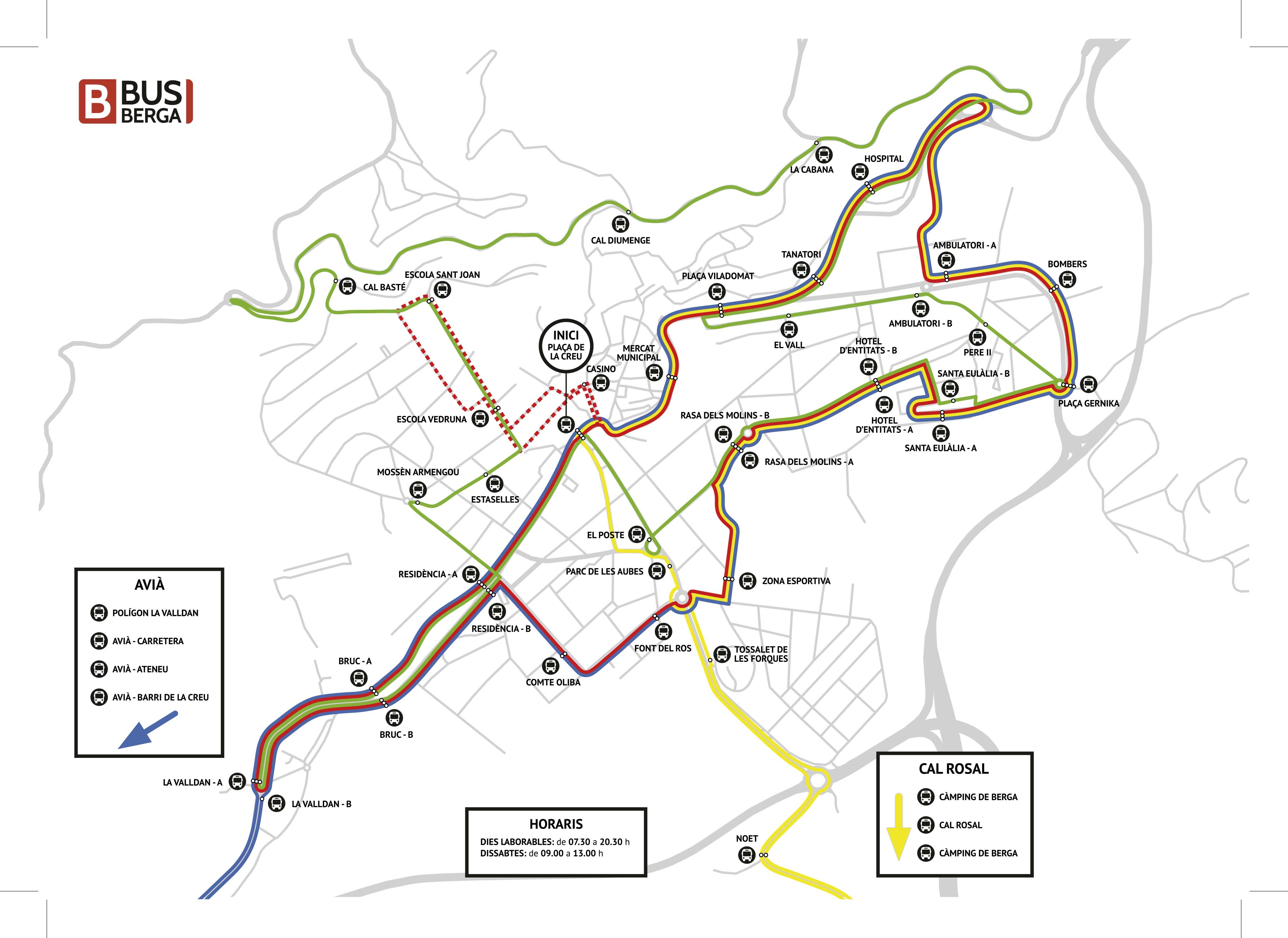 El servei de bus urbà seguirà sent de dilluns a dissabte al matí i cal destacar que la implantació de les noves línies coincideix amb un parell de millores a la via pública: la creació d’una rotonda a la intersecció del carrer del Roser- Rasa del Canyet-Compte Oliba-carretera de Solsona i amb un canvi de sentit de la circulació al carrer Bruc.