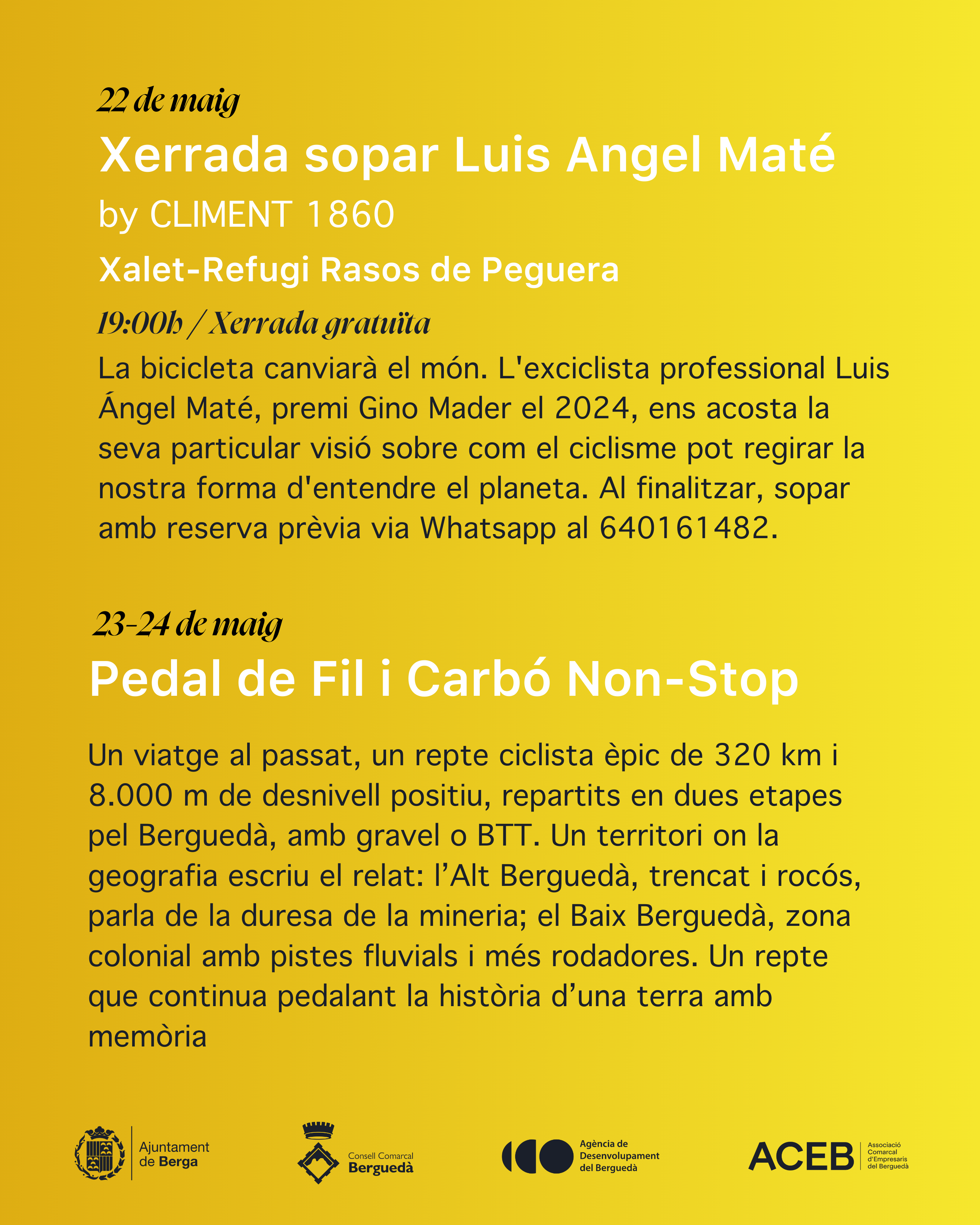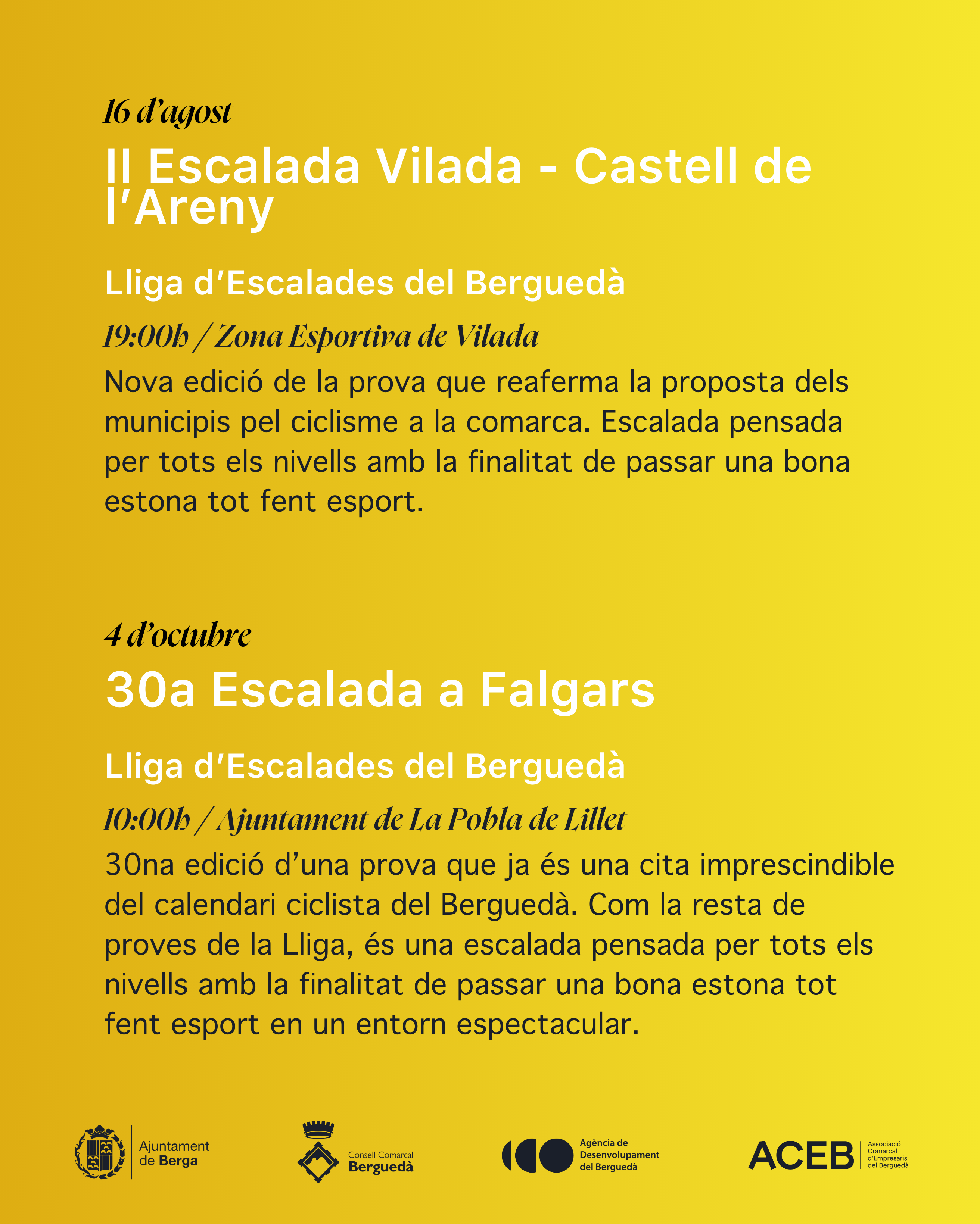 La Lliga d’Escalades del Berguedà es fa possible gràcies al suport del Consell Comarcal del Berguedà, que ha volgut sumar-se a aquesta iniciativa que posa en valor les ascensions ciclistes de la comarca i reforça el posicionament del Berguedà com a territori ciclista.