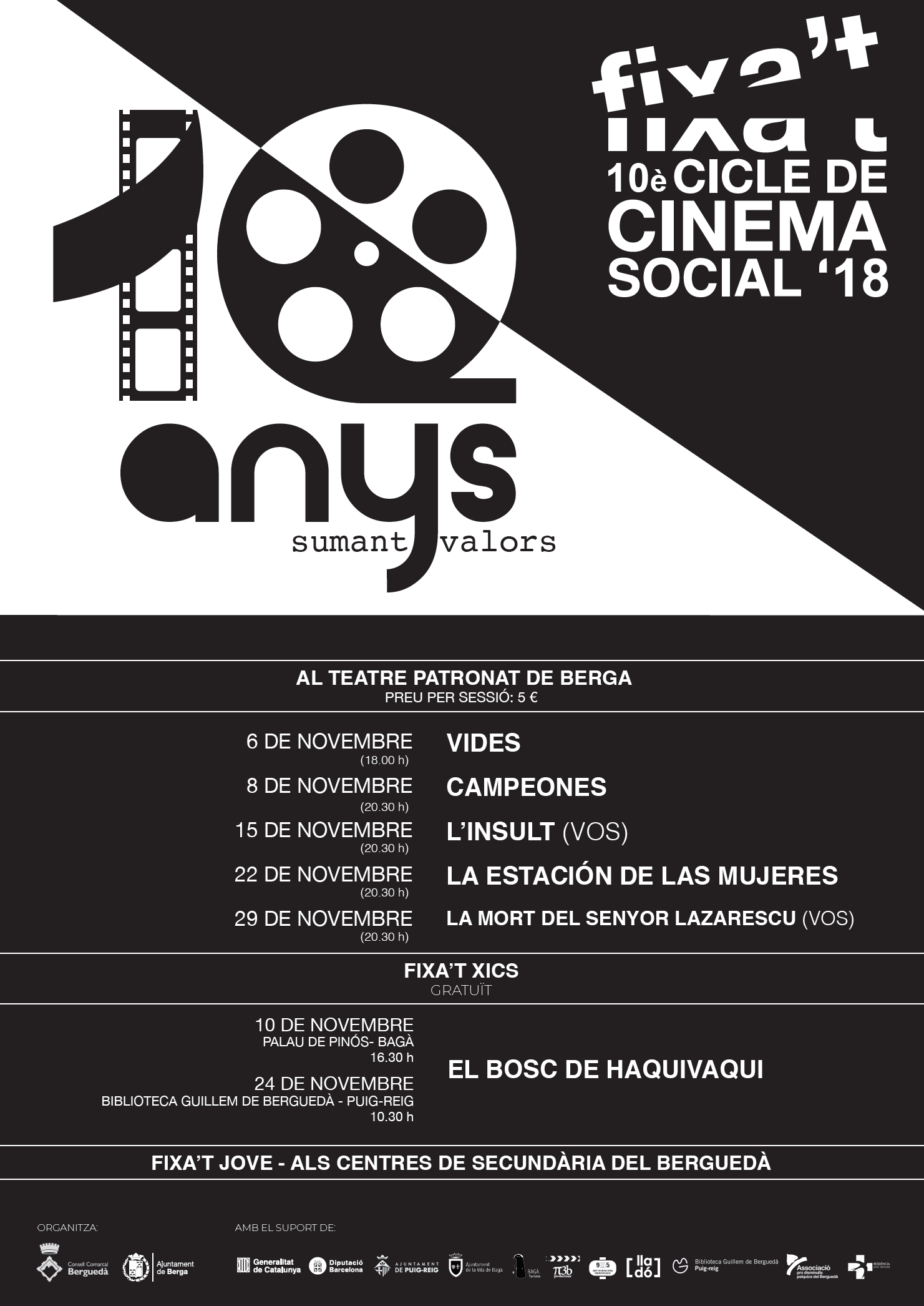 La presentació de les dades d’aquests 10 anys, l’han fet el president del Consell Comarcal, Josep Lara, i la regidora de Cultura de l’Ajuntament de Berga, Mònica Garcia. Ha estat en la sessió inaugural del Fixa’t 2018, dimarts 6 de novembre, amb “Vides”, el documental sobre la vida de deu avis i àvies residents a la Residència Sant Bernabé de Berga. Durant tots els dijous de novembre, es podran veure les 4 pel.licules d’aquesta edició: “Campeones”, “L’insult”, “La estación de las mujeres” i “La mort del senyor Lazarescu”.