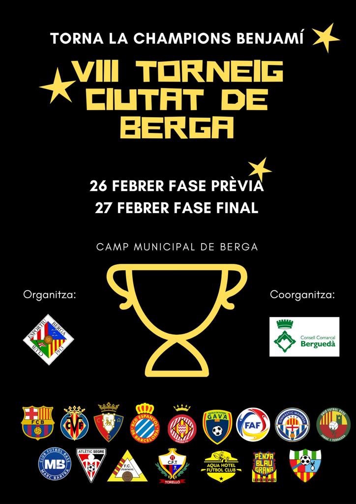 El Club Esportiu Berga i el Consell Comarcal del Berguedà, amb el suport de l’Ajuntament de Berga, organitzen el proper cap de setmana, 26 i 27 de febrer, el VIII Torneig Ciutat de Berga de futbol en categoria benjamí.