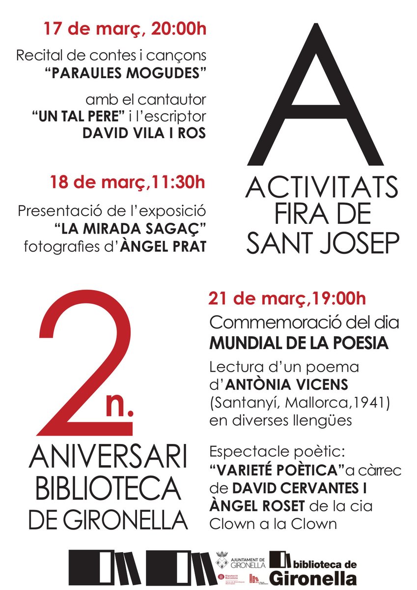 Gironella celebra aquest cap de setmana coincidint amb la Fira de Sant Josep, el segon aniversari de la Biblioteca de la vila. Entre els actes previstos hi ha contes, exposicions i la commemoració del dia mundial de la Poesia el proper 21 de març.C69i60YXAAI6jj-