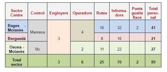 Pel que fa al sector de prevenció Centre, que comprès les comarques del Bages, Osona, Berguedà i Moianès, el dispositiu estarà format per un total de 89 persones, dels quals tres són enginyers i sis operadors, situats als centres de control de Manresa i Vic, que cobriran un total de 25 rutes pel territori així com per dos punts de guaita a Mura i Monistrol de Calders dins el Parc Natural de Sant Llorenç del Munt i l’Obac.
