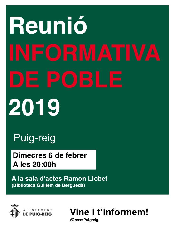 El proper dimecres 6 de febrer es portarà a terme una Reunió Informativa de Poble a Puig-reig. Es tracta d’una trobada anual entre l’administració local i la ciutadania de Puig-reig amb la finalitat d’explicar els projectes previstos per l’equip de govern durant tot l’any. L’Ajuntament espera que la jornada sigui participativa i que serveixi per exposar problemàtiques i inquietuds alhora que es debati de forma oberta i transversal sobre el futur del municipi. L’acte, que se celebrarà a les 8 del vespre a la sala d’actes Ramon Llobet de la Biblioteca de Puig-reig és obert a tothom.