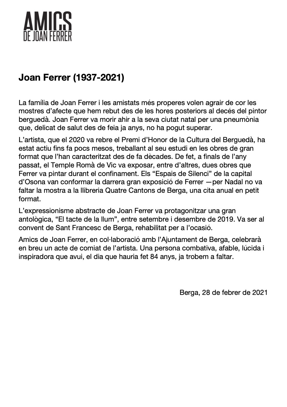 L’Ajuntament de Berga vol mostrar el seu condol i escalf a la família i amistats de Joan Ferrer i agraeix el seu llegat artístic i la seva estima per la ciutat.