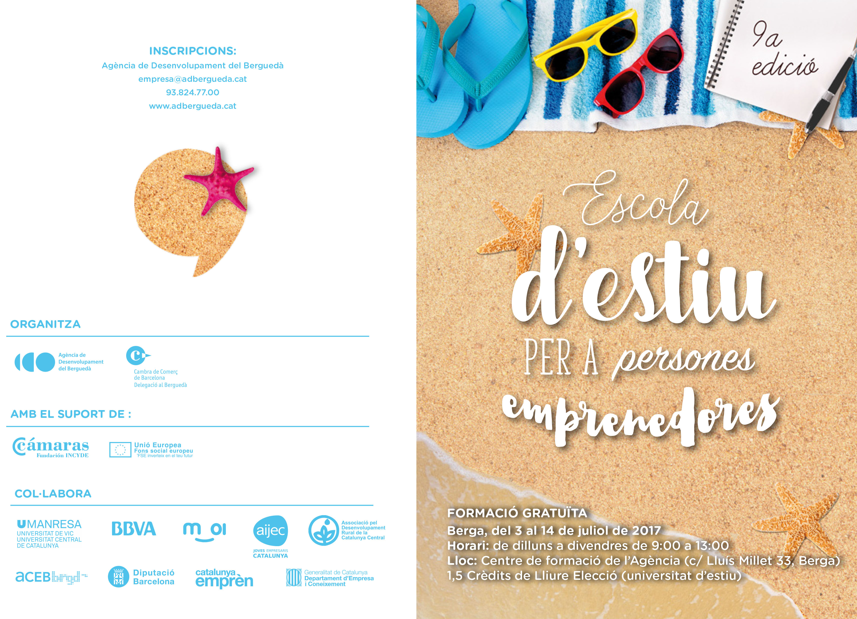 L’Escola d’Estiu per Persones Emprenedores és una iniciativa de l’Agència de Desenvolupament del Berguedà i la Cambra de Comerç de Barcelona, i compta amb la col·laboració de la Universitat de Manresa, BBVA, MoiAcció, l’Associació de Joves Emprenedors de Catalunya, l’Associació pel Desenvolupament Rural de la Catalunya Central i l’Associació Comarcal d’Empresaris del Berguedà, i amb el suport la Diputació de Barcelona, el programa Catalunya Emprèn i la Fundación INCYDE.