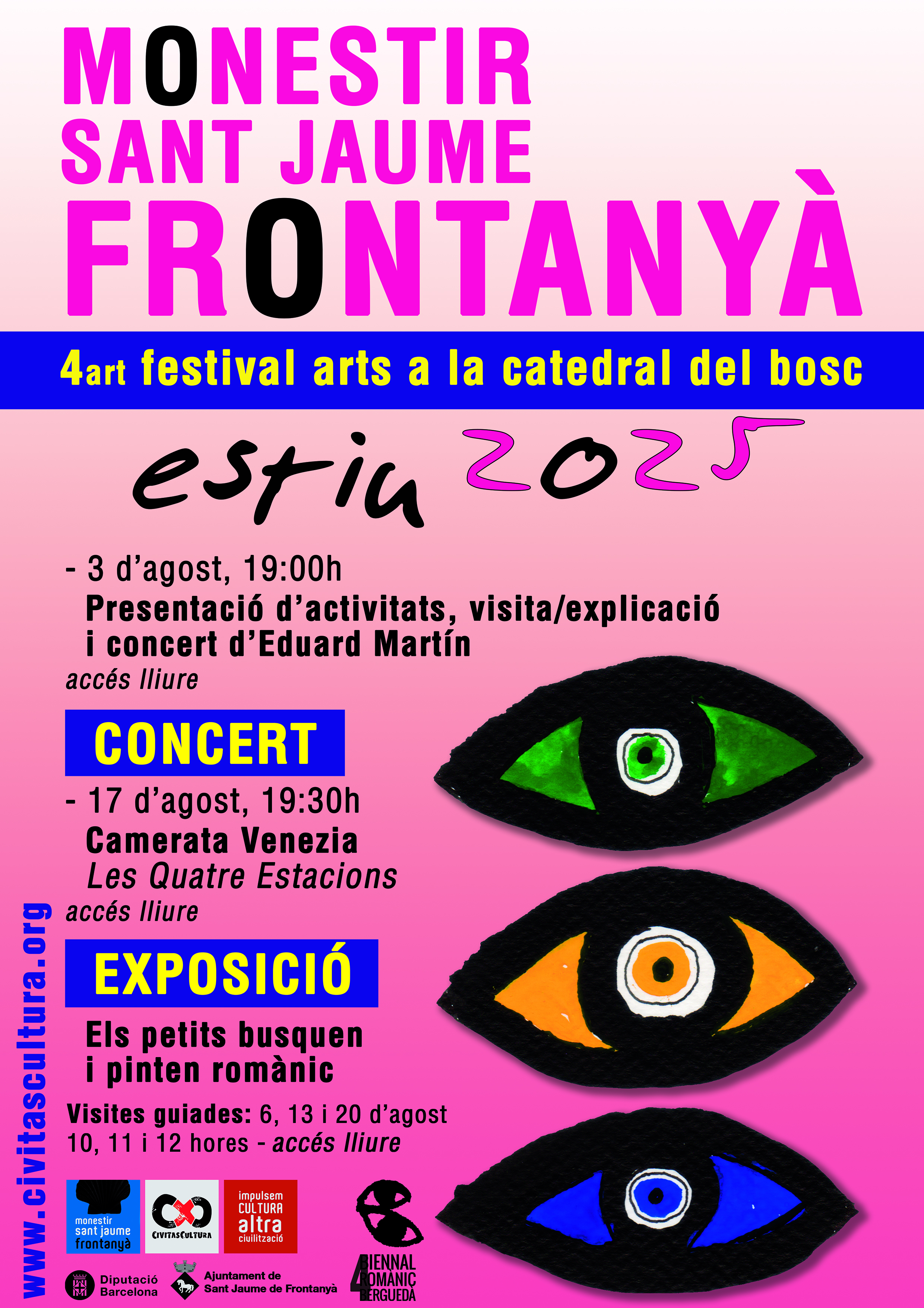 Sant Jaume de Frontanyà, sota el paraigua d’Arts a la Catedral del Bosc, oferirà dos concerts el 3 i el 17 d’agost, aquest amb les Quatre Estacions de Vivaldi. Durant l’estiu s’hi podrà veure una exposició dels dibuixos dels petits de l’escola Santa Maria d’Avià que han reinterpretat el romànic. Tots, creatius agosarats. Visites guiades matins del 6, 13 i 20 d’agost.