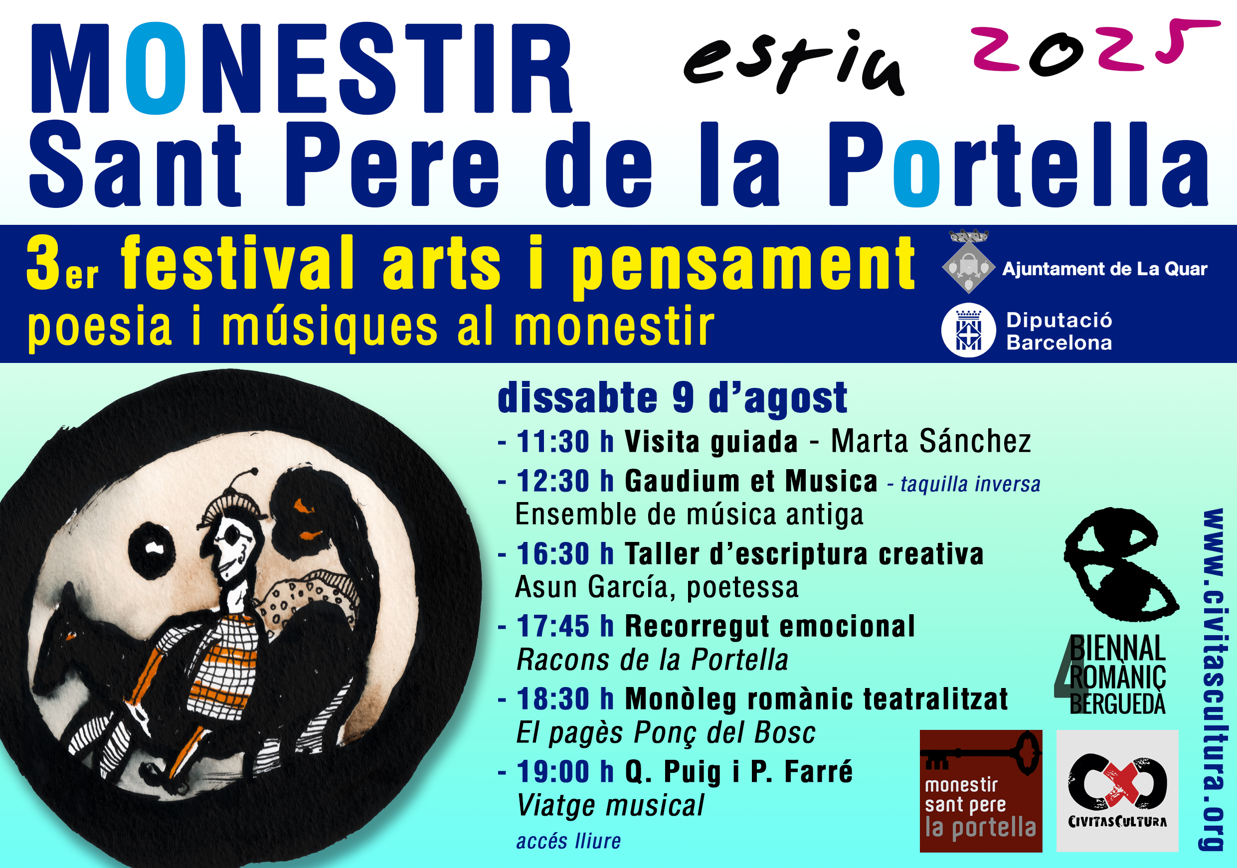 A Sant Pere de la Portella, agrupats sota Arts i Pensament, el 9 d’agost, matí i tarda, compartirà concerts i poesia en un espai paisatgístic i suggerent, amb un memorial al genial músic català i abat del monestir, Mateu Fletxa el Jove.
